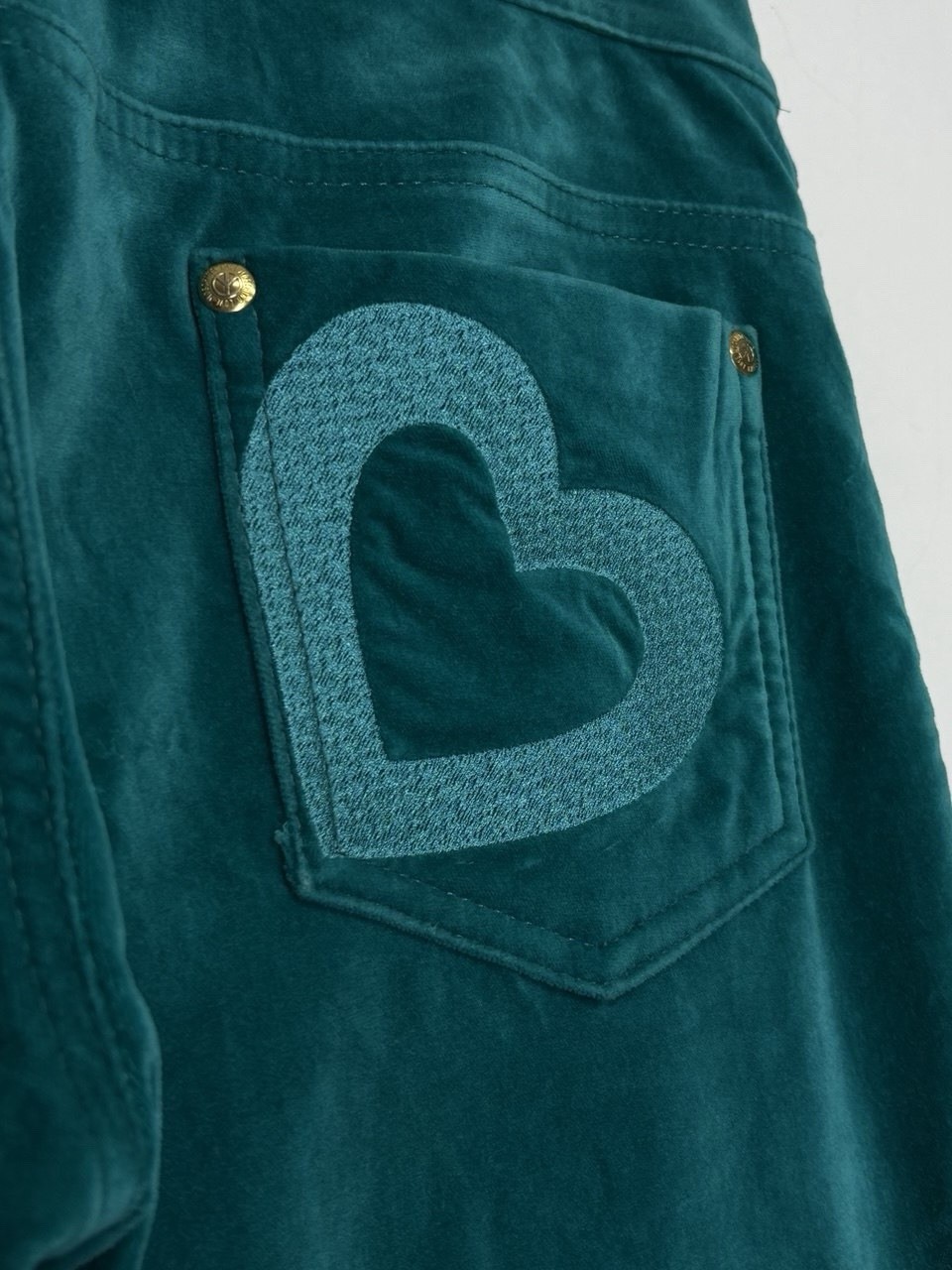 Love Moschino Green Turquoise Heart Pocket Logo Velour Pants Women s Size 26