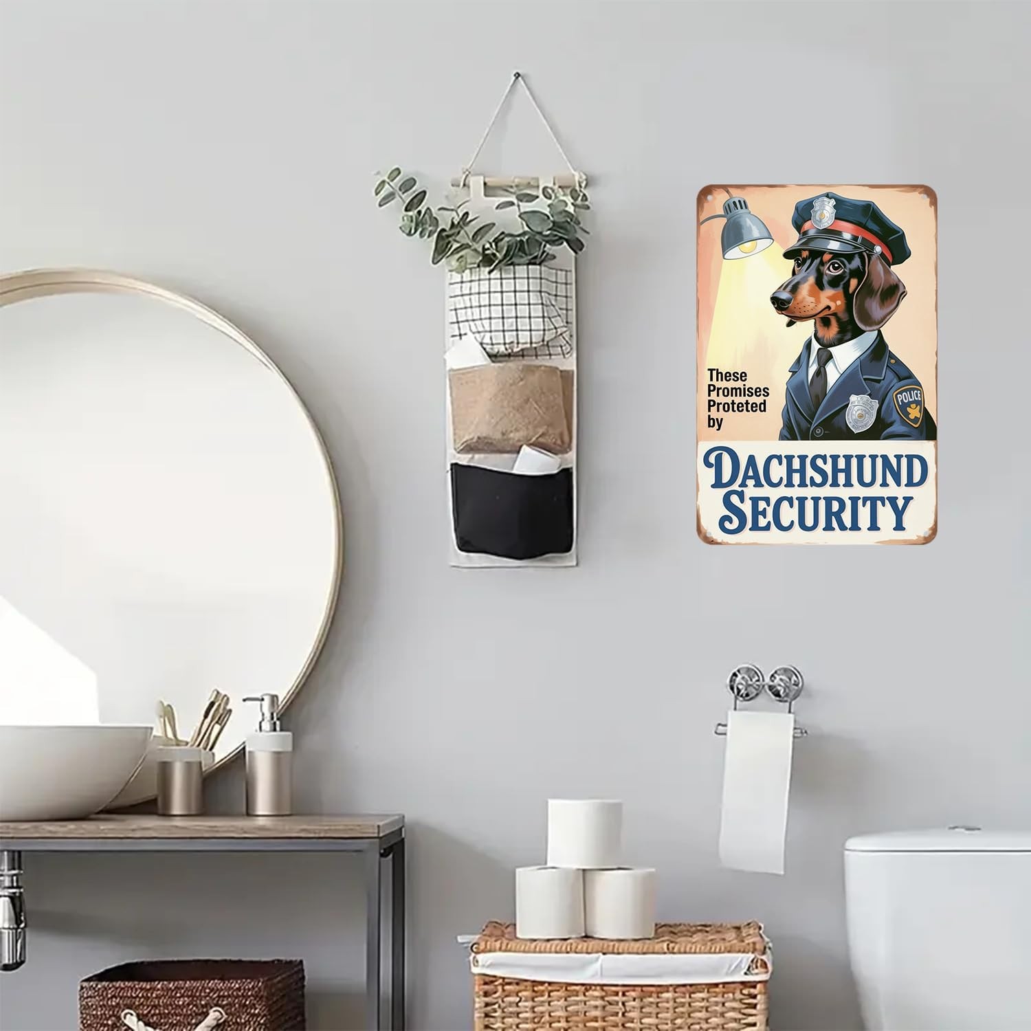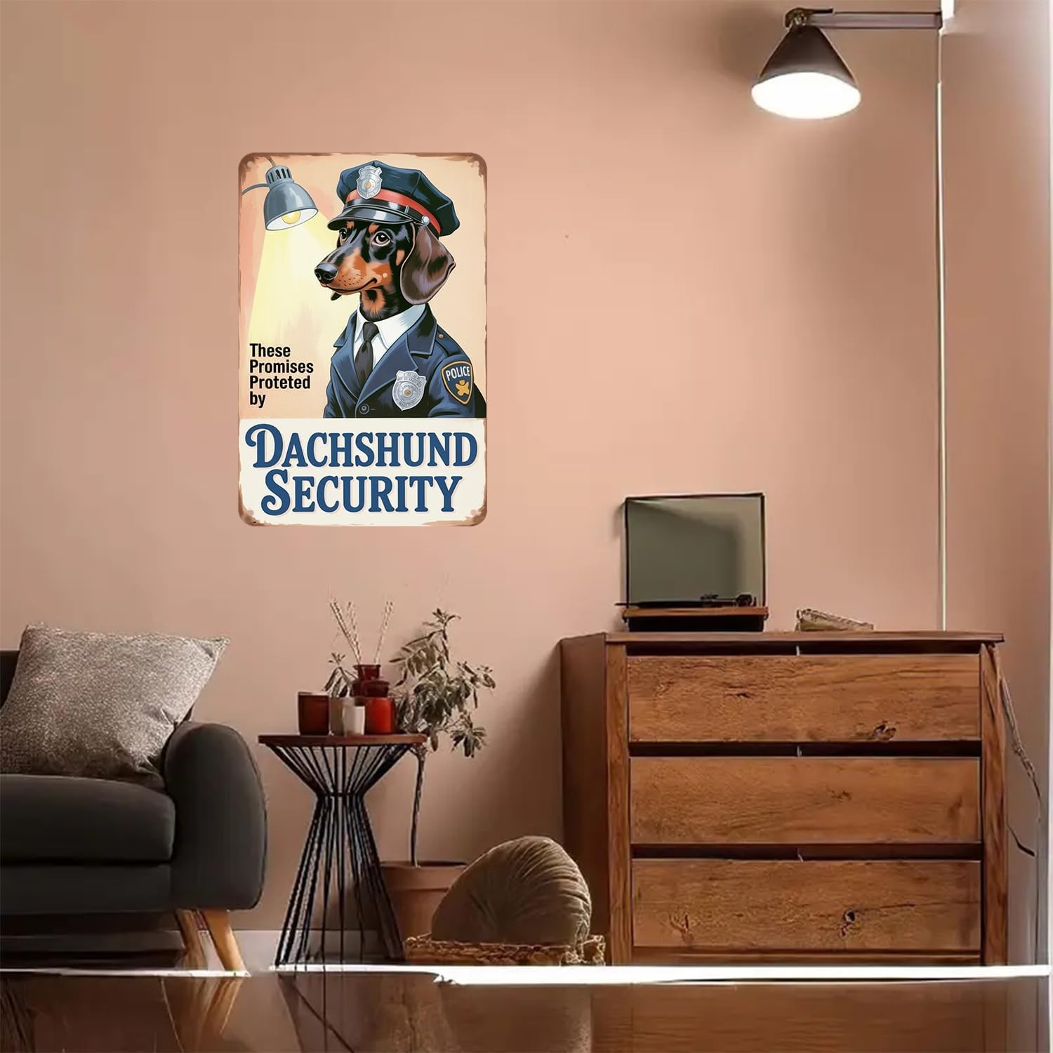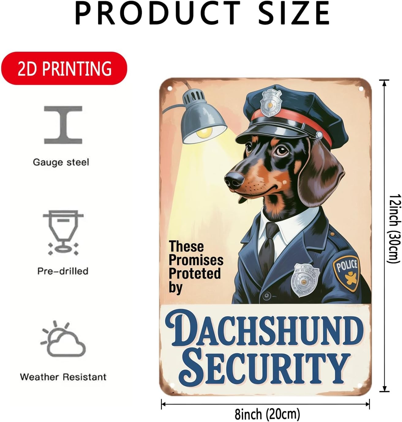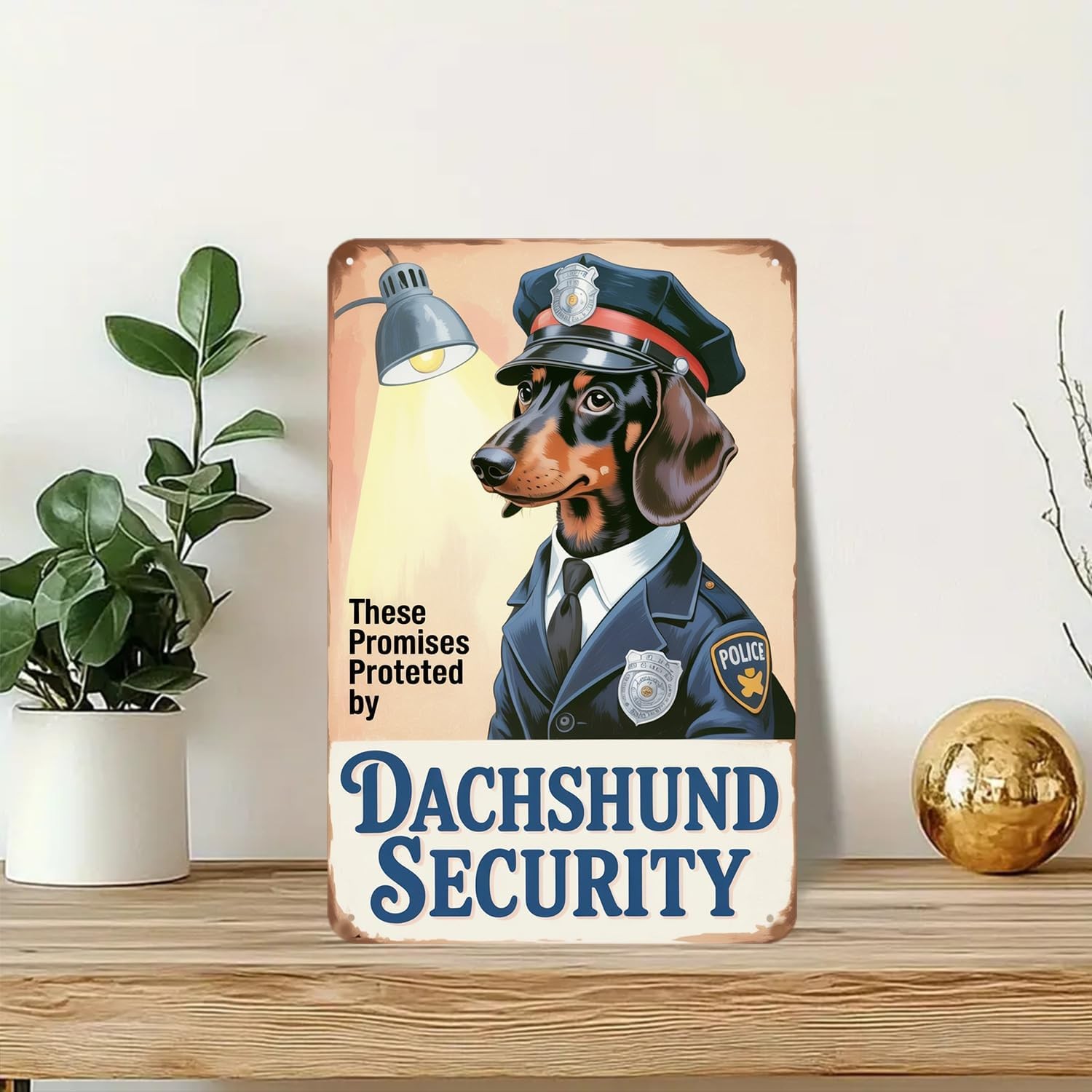 VINTAGE DESIGN: Charming retro-style metal sign featuring a Dachshund in police u