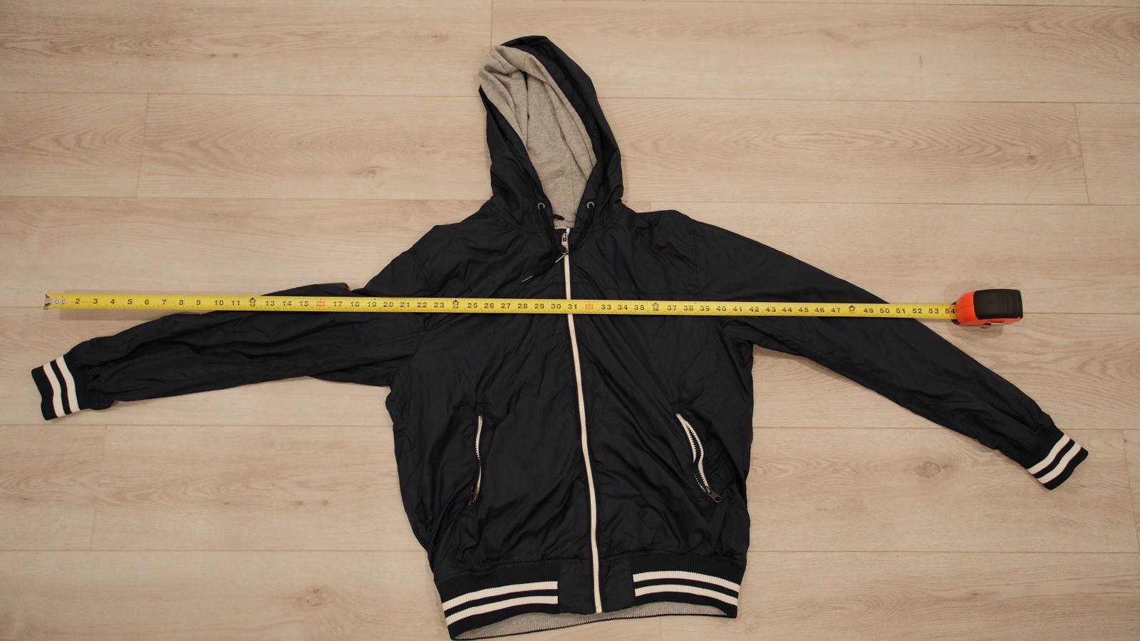 как выглядит H M NAVY BLUE SIZE L ZIP UP HOODIE DAMAGED фото