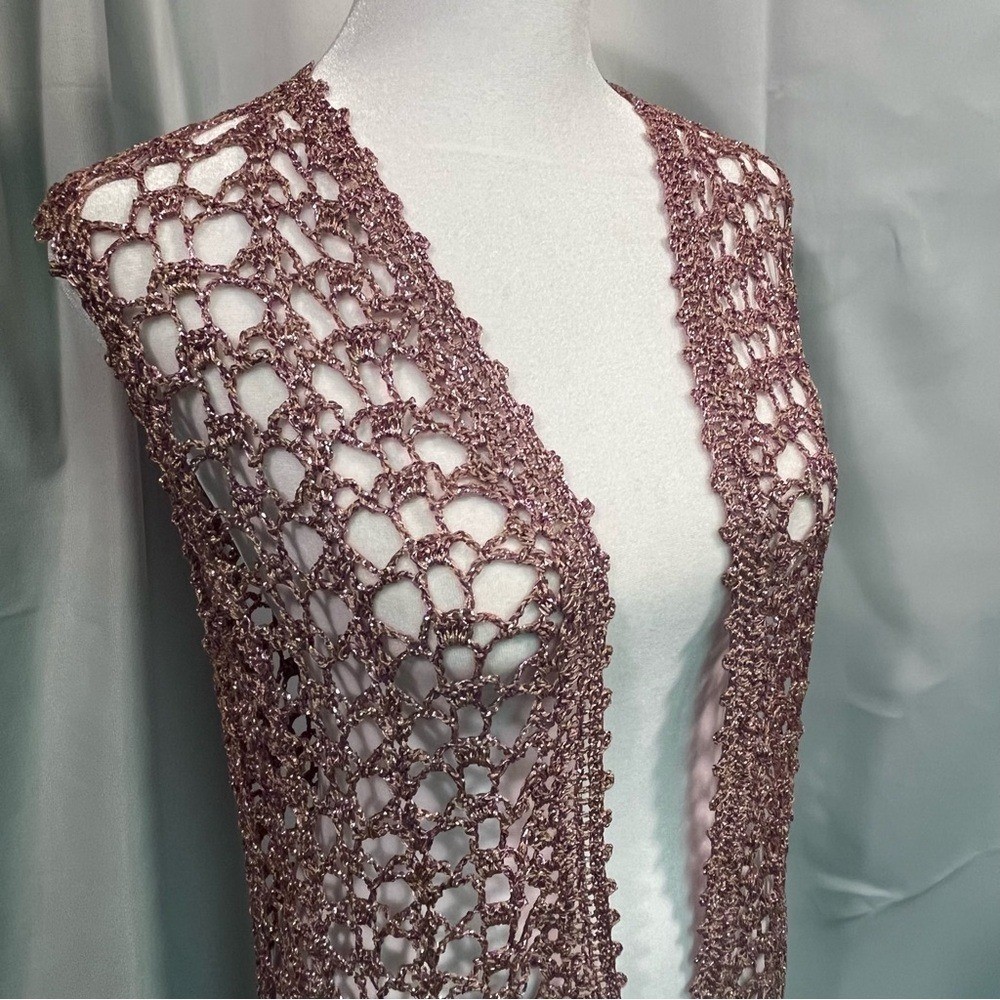 как выглядит Hand Crochet Open Front Vest in Shiny Dusty Rose M/L Festival Retro Whimsical фото