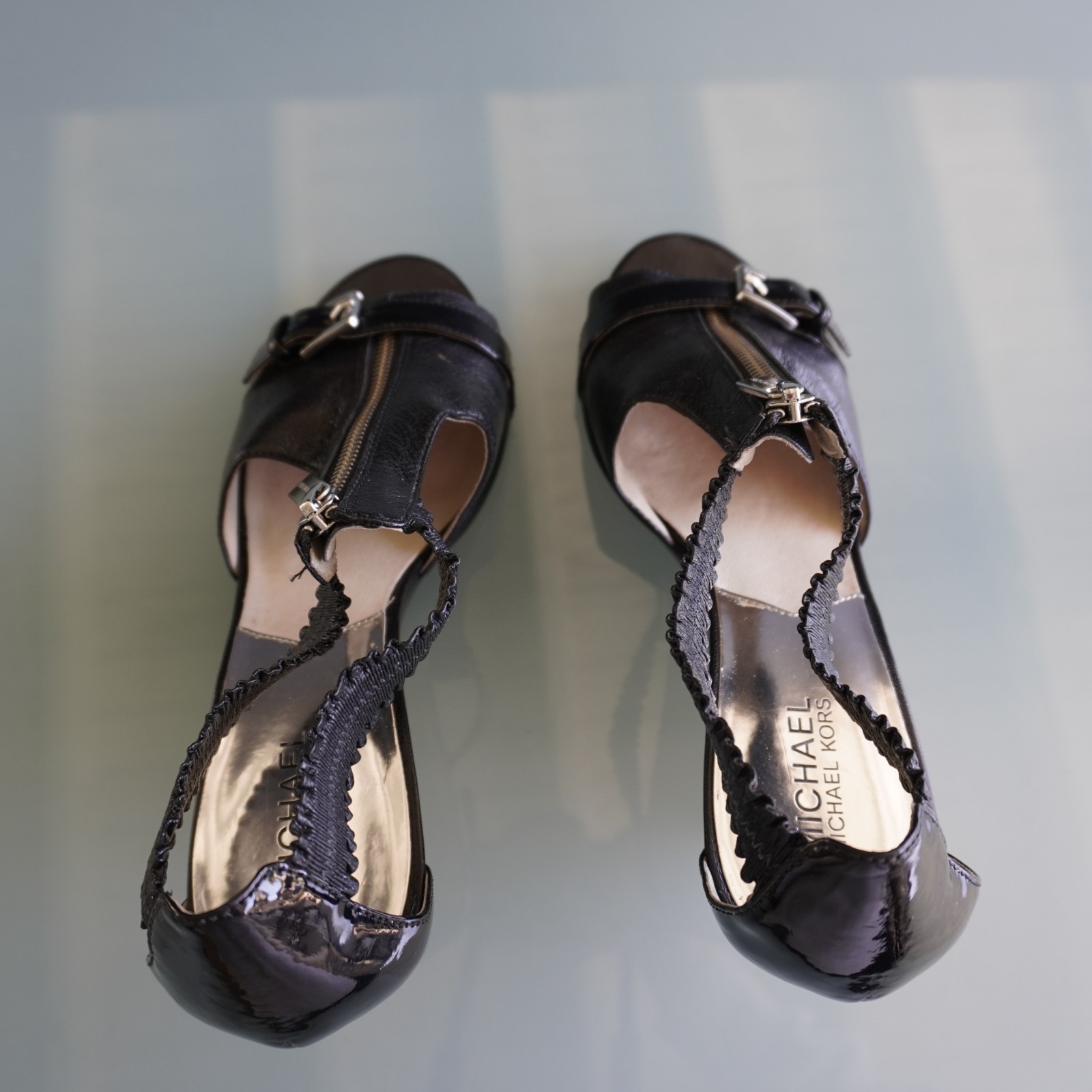 как выглядит Michael Michael Kors Berkley Wedge Sandals 10M Black Leather Zipper Front Buckle фото