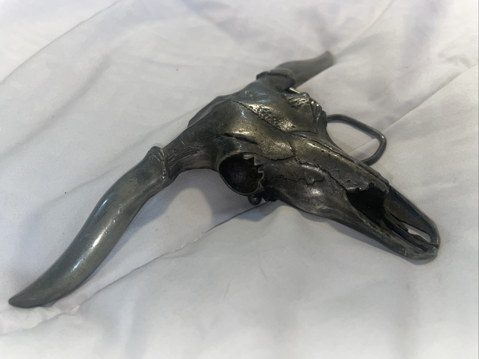LONGHORN SKULL BELT BUCKLE, CIRCA 1977, MADE FROM FINE PEWTER, 7 HORNS