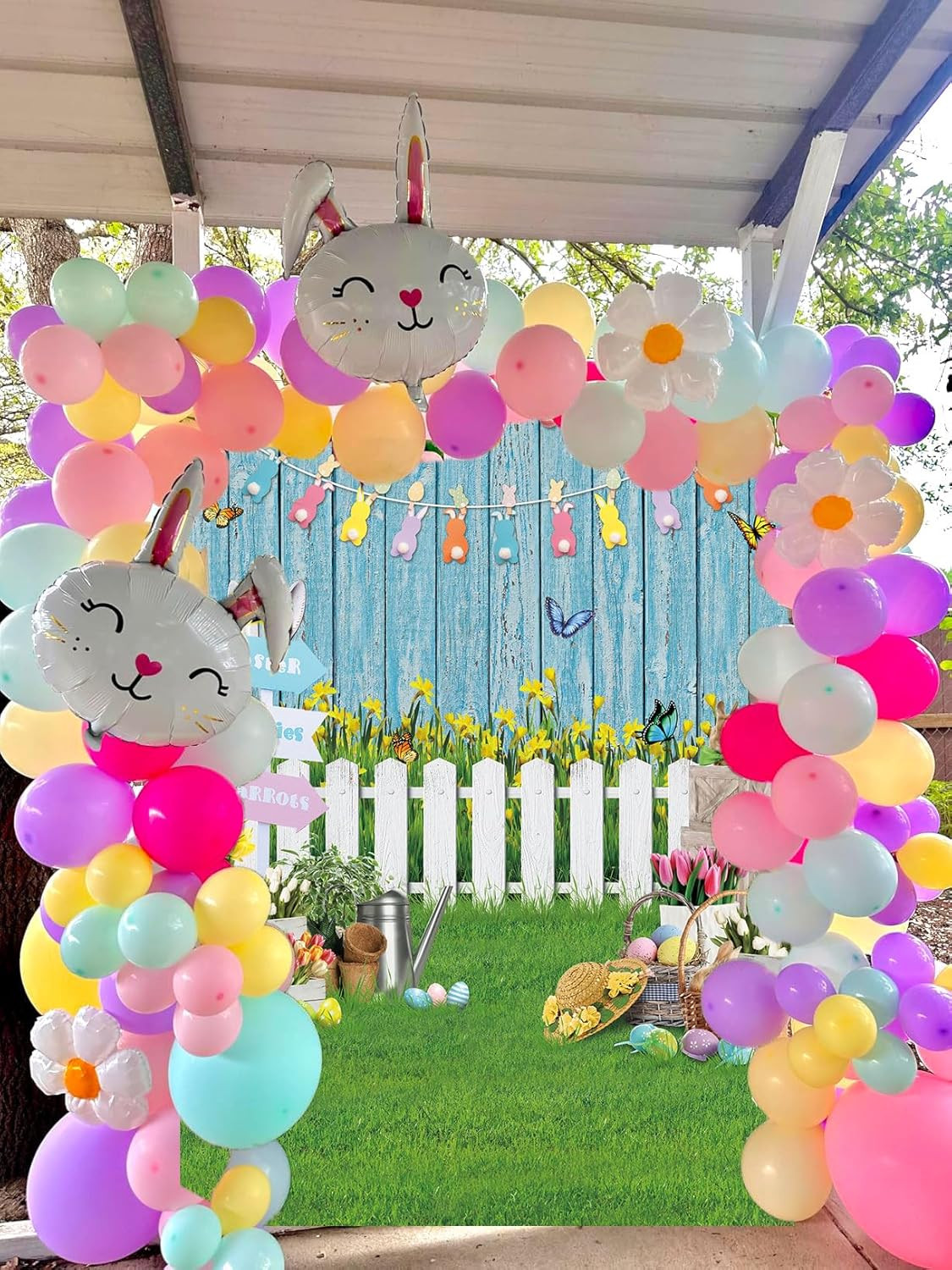 как выглядит Spring Easter Photography Backdrop 5X7Ft Blue Wooden Wall Lawn Colorful Eggs Bun фото