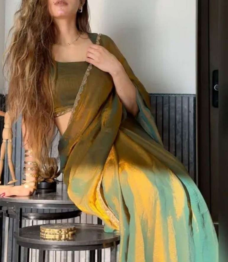 Solid Banarasi Chiffon Saree with Unstitched Blouse Gold