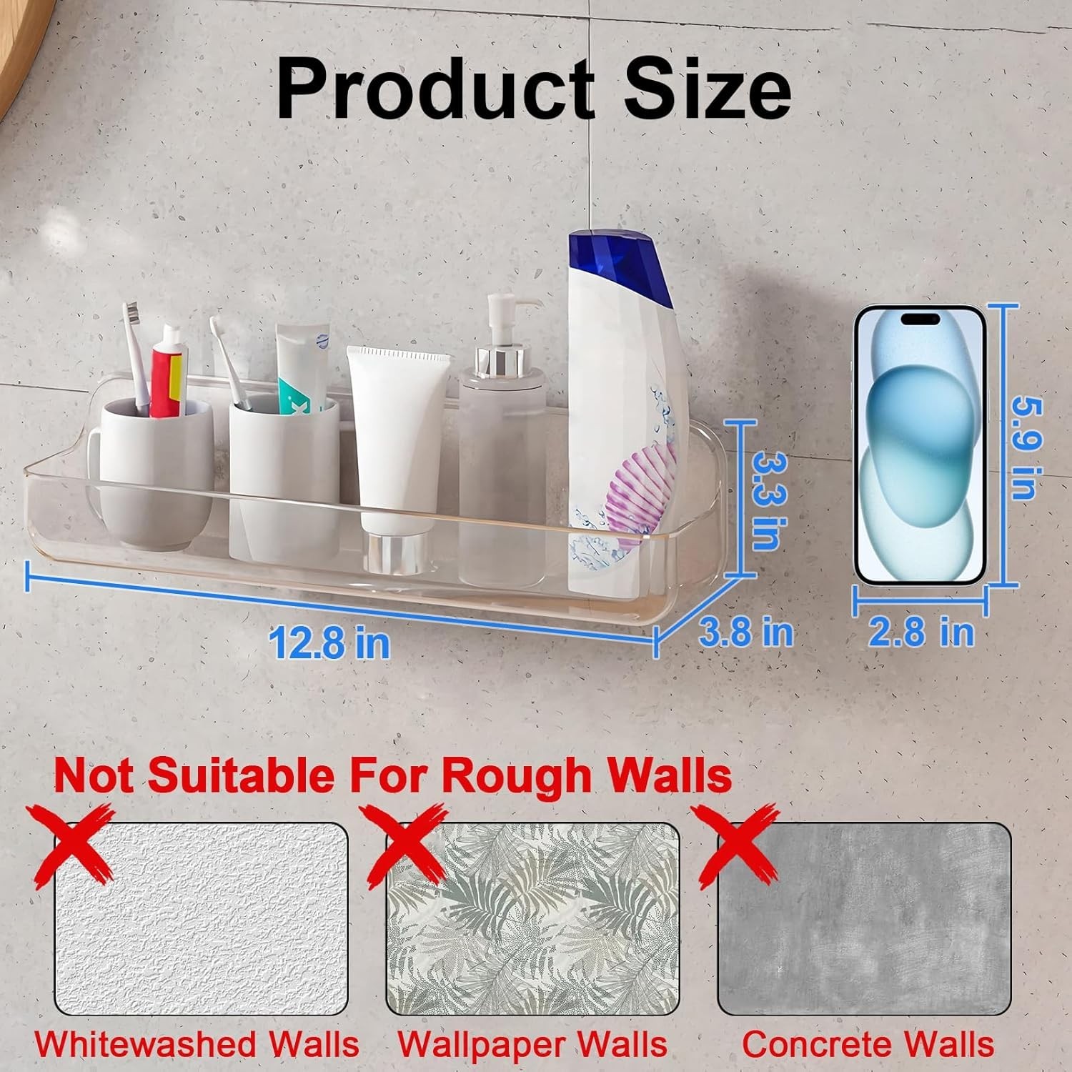 Acrylic Wall Mounted Shower Caddy Clear Large Size 4D x 12.8 W x 3.3 H Acrylic
