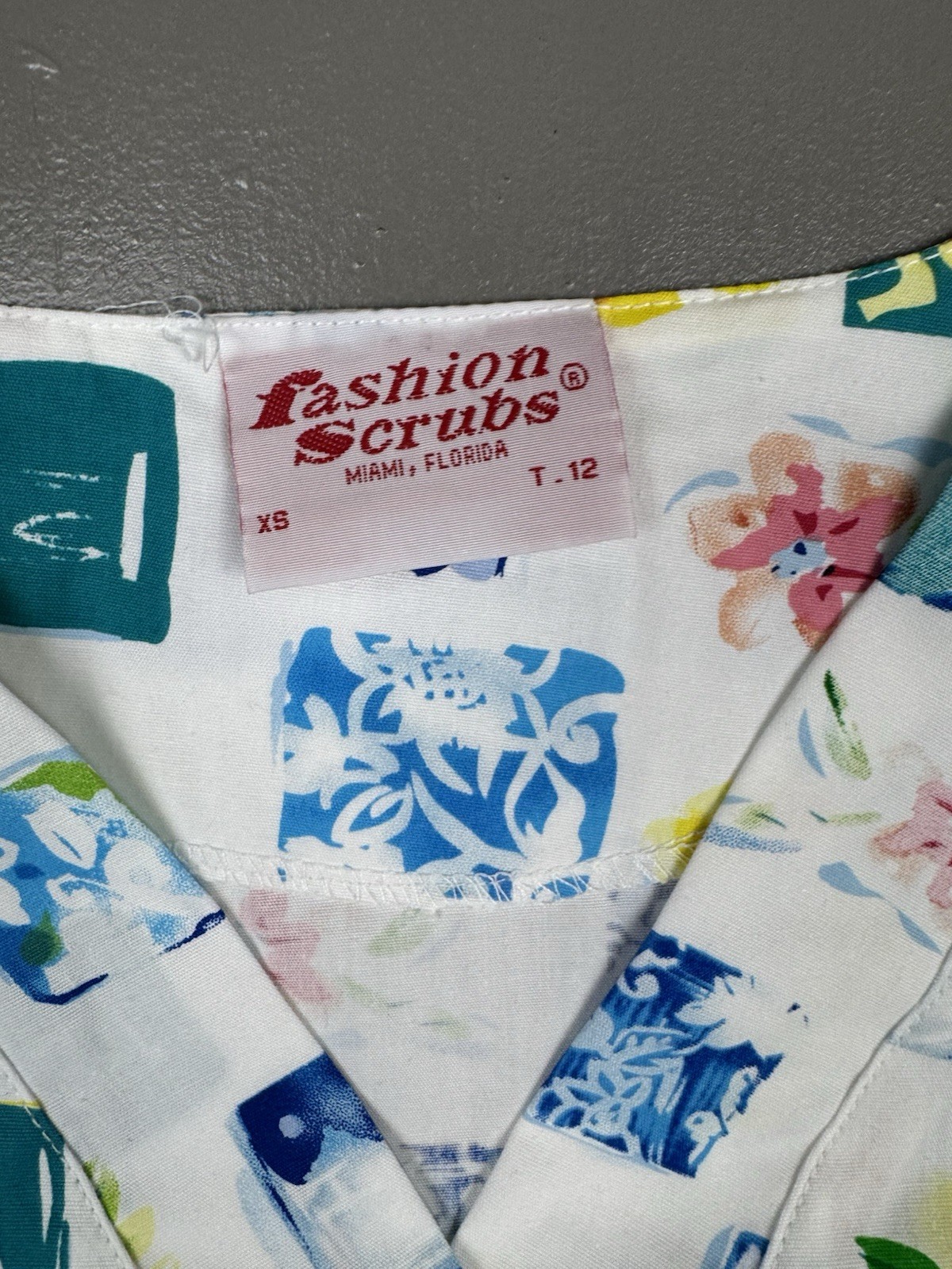 Fashion Women's Scrub Top Size X-Small Floral Print Multicolor V Neck White NEW