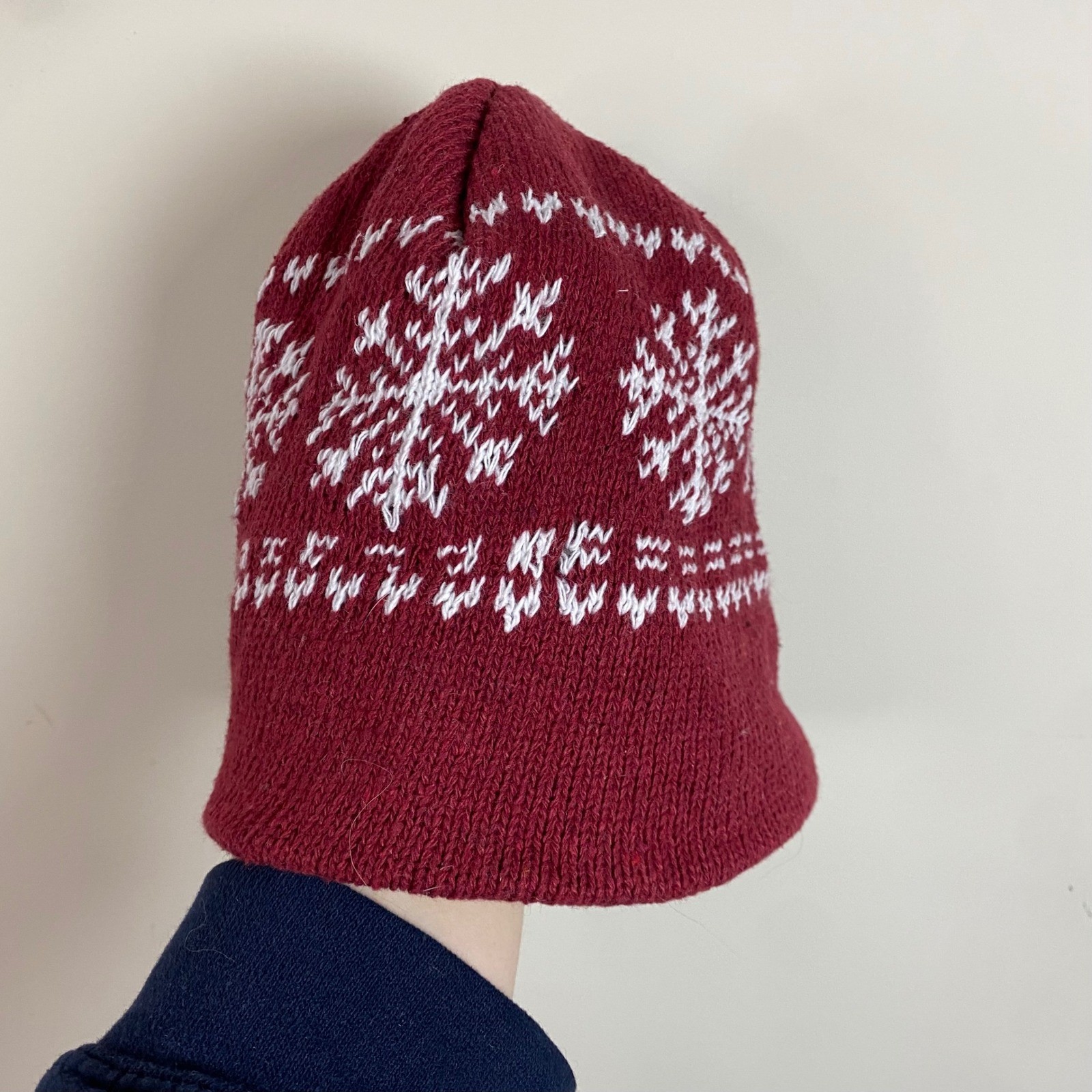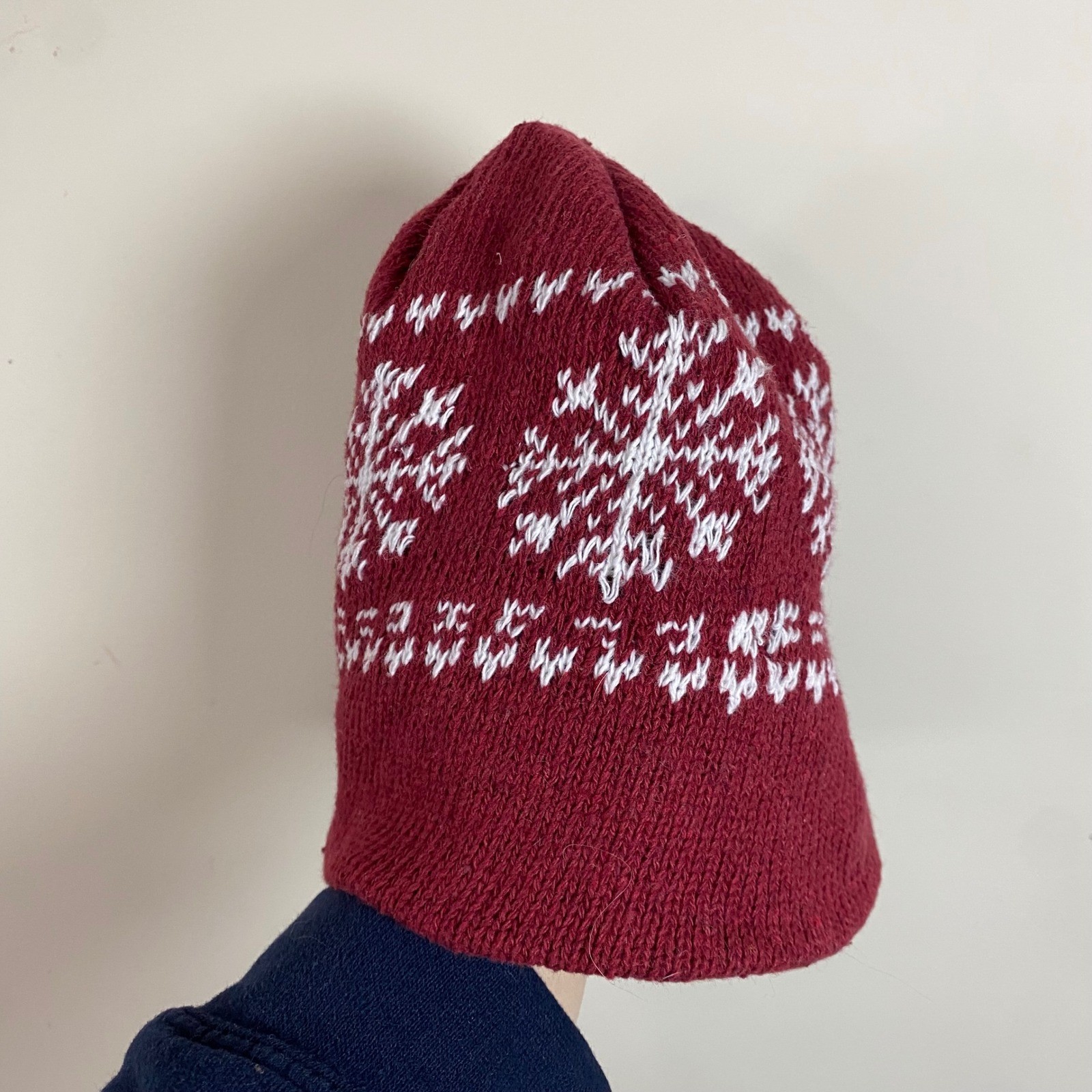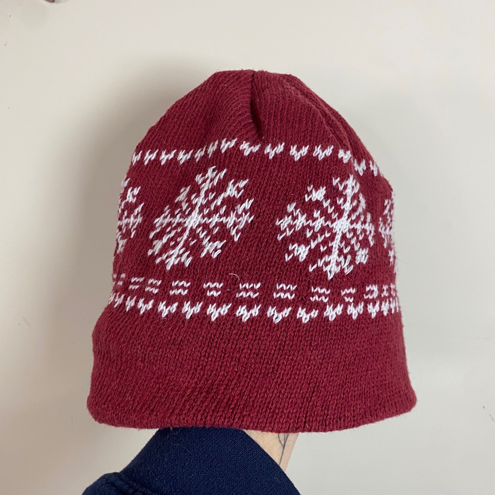 как выглядит Red Knit Beanie Fleece Lined Winter Hat White Snowflake Design Ski Cozy Gorpcore фото