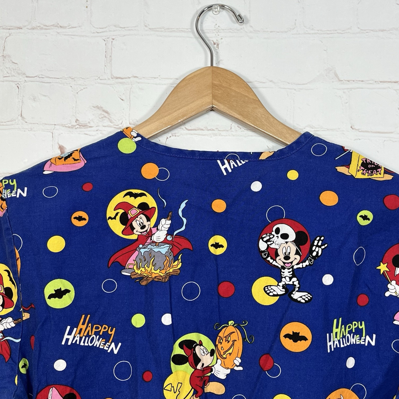 Disney Halloween Mickey Mouse Minnie Scrub Top Womens Size Small Blue V Neck