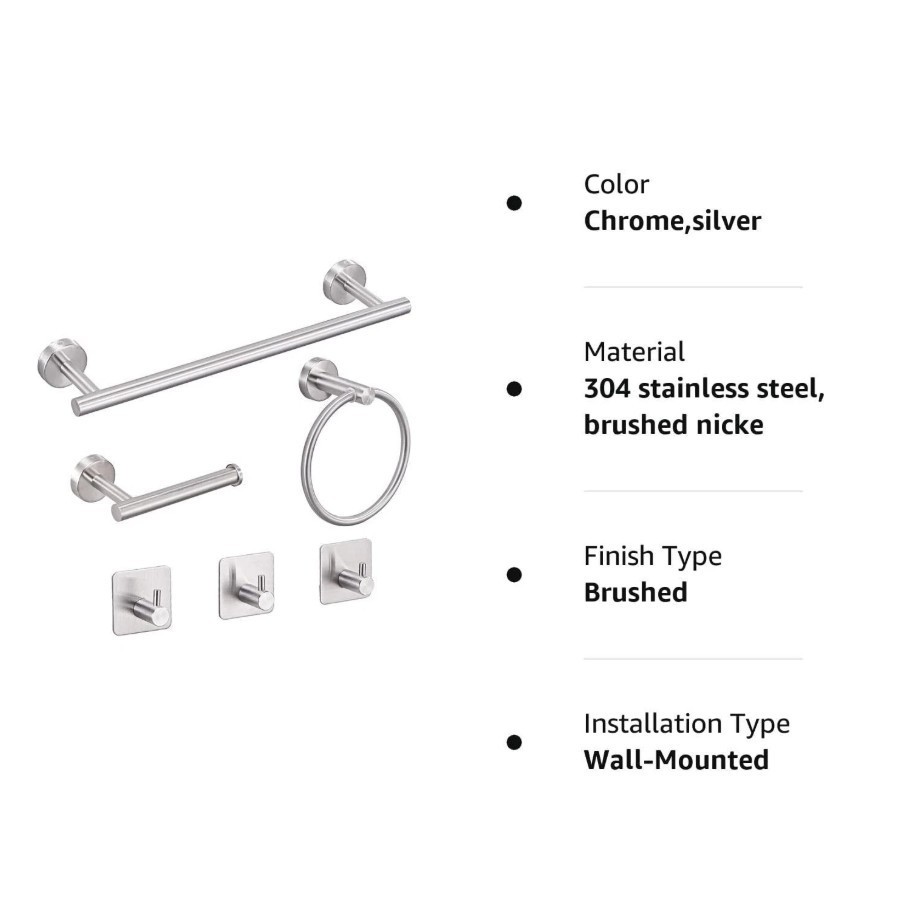Set Includes: Toilet Paper Holder, Towel Rail, Towel Ring, 3 Robe Hooks