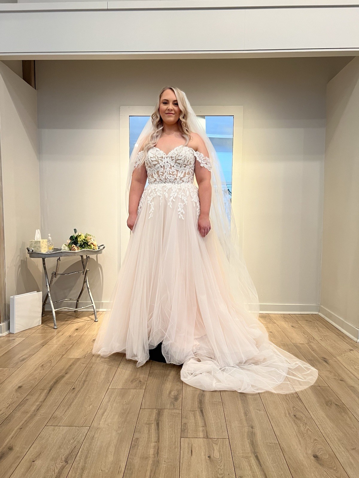 как выглядит Ivory Champagne Lace Tulle Off-Shoulder A-Line Ball Gown Wedding Dress фото