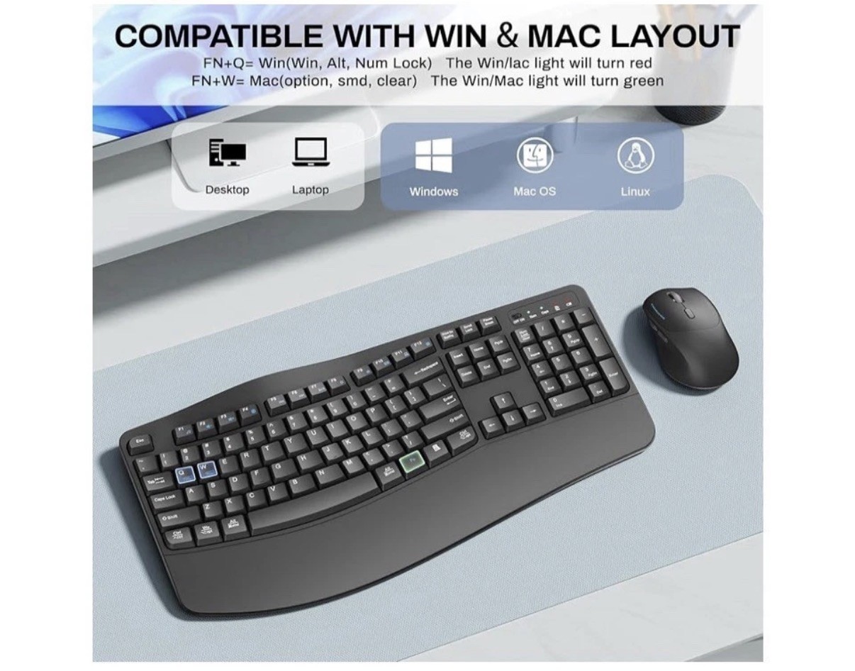 Wireless Keyboard and Mouse Combo, 2.4G Full Size Wave Keys Ergonomic Keyboard