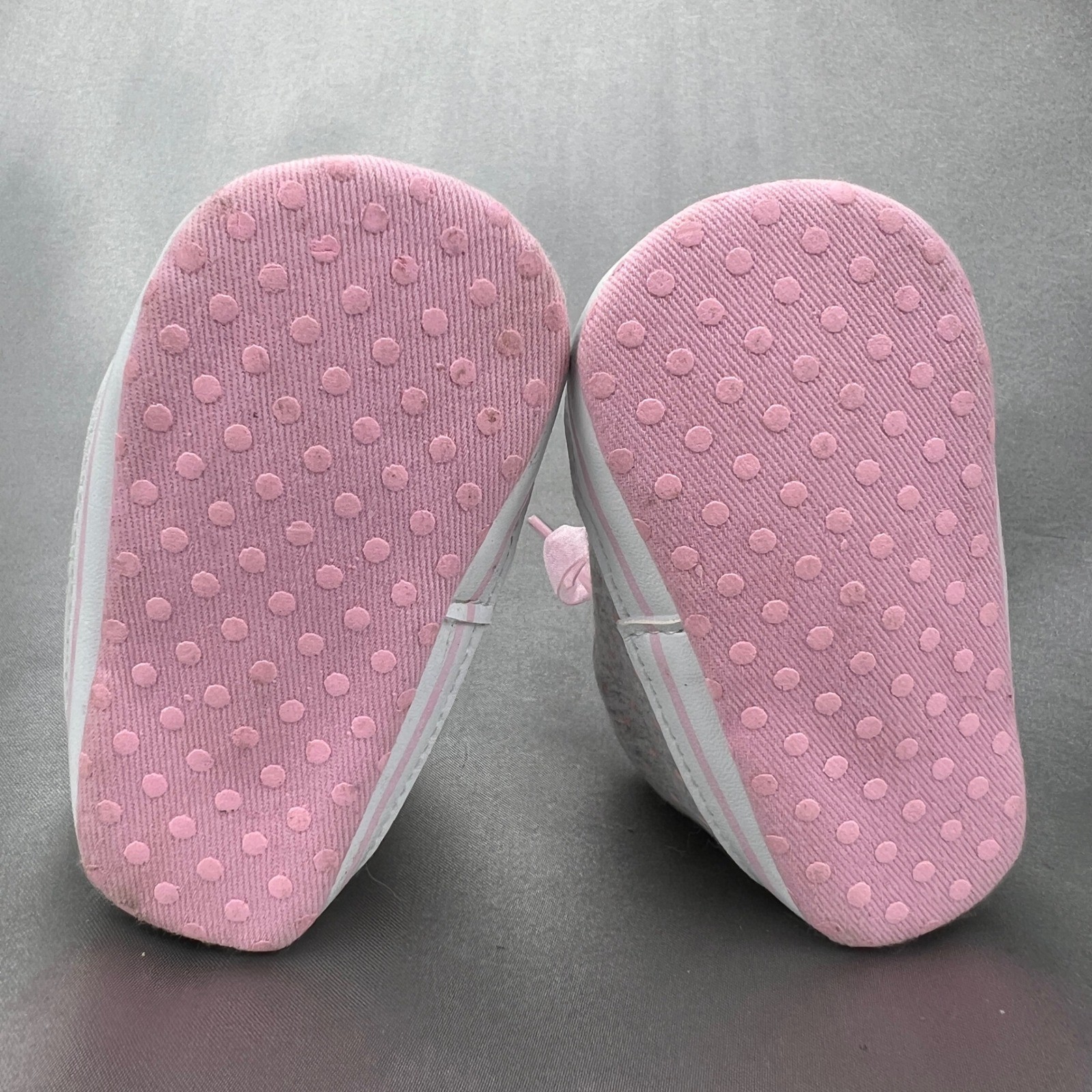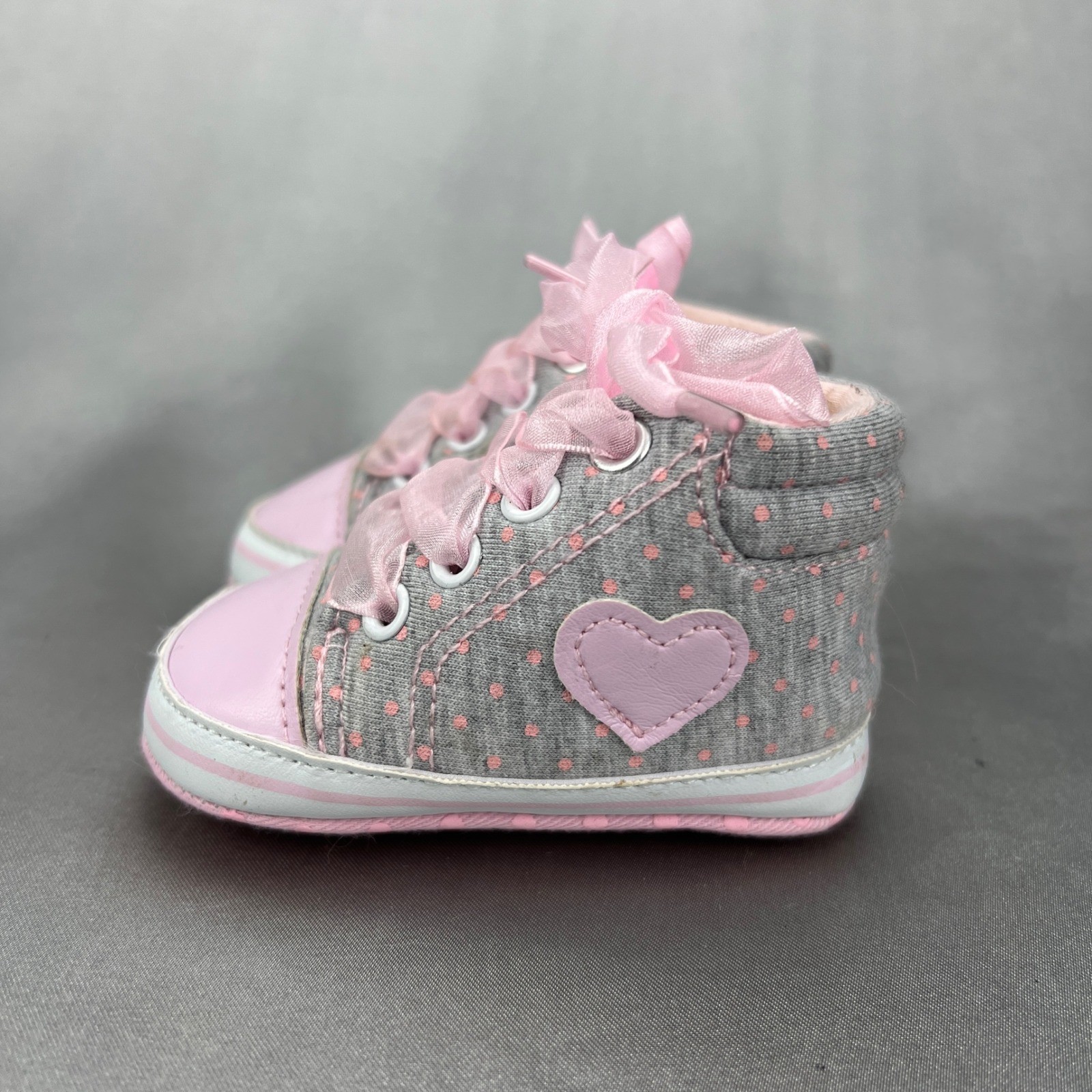 Infant Baby Girl Crib Shoes Gray Pink Polka Dot Heart Ribbon Lace High Top 3-6M