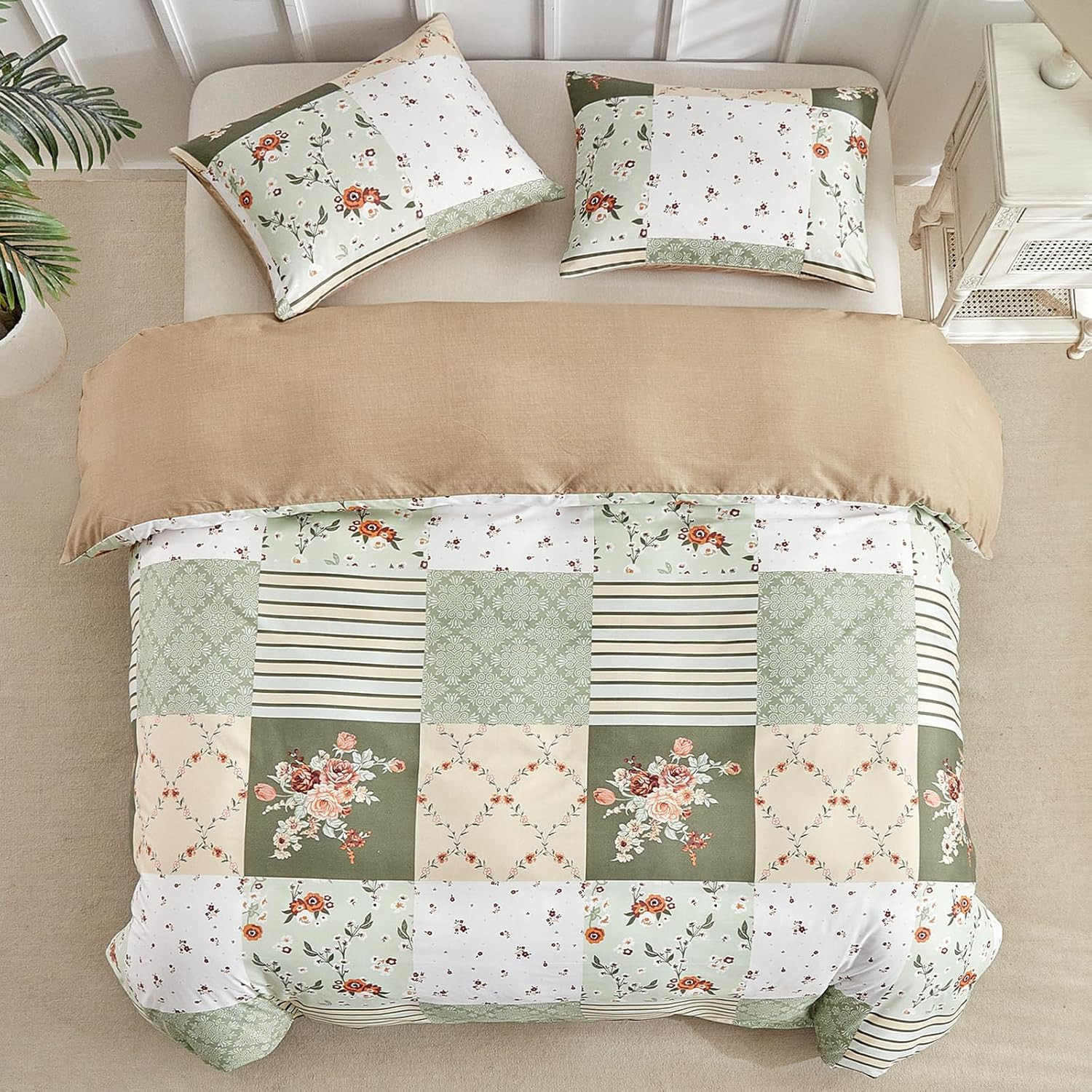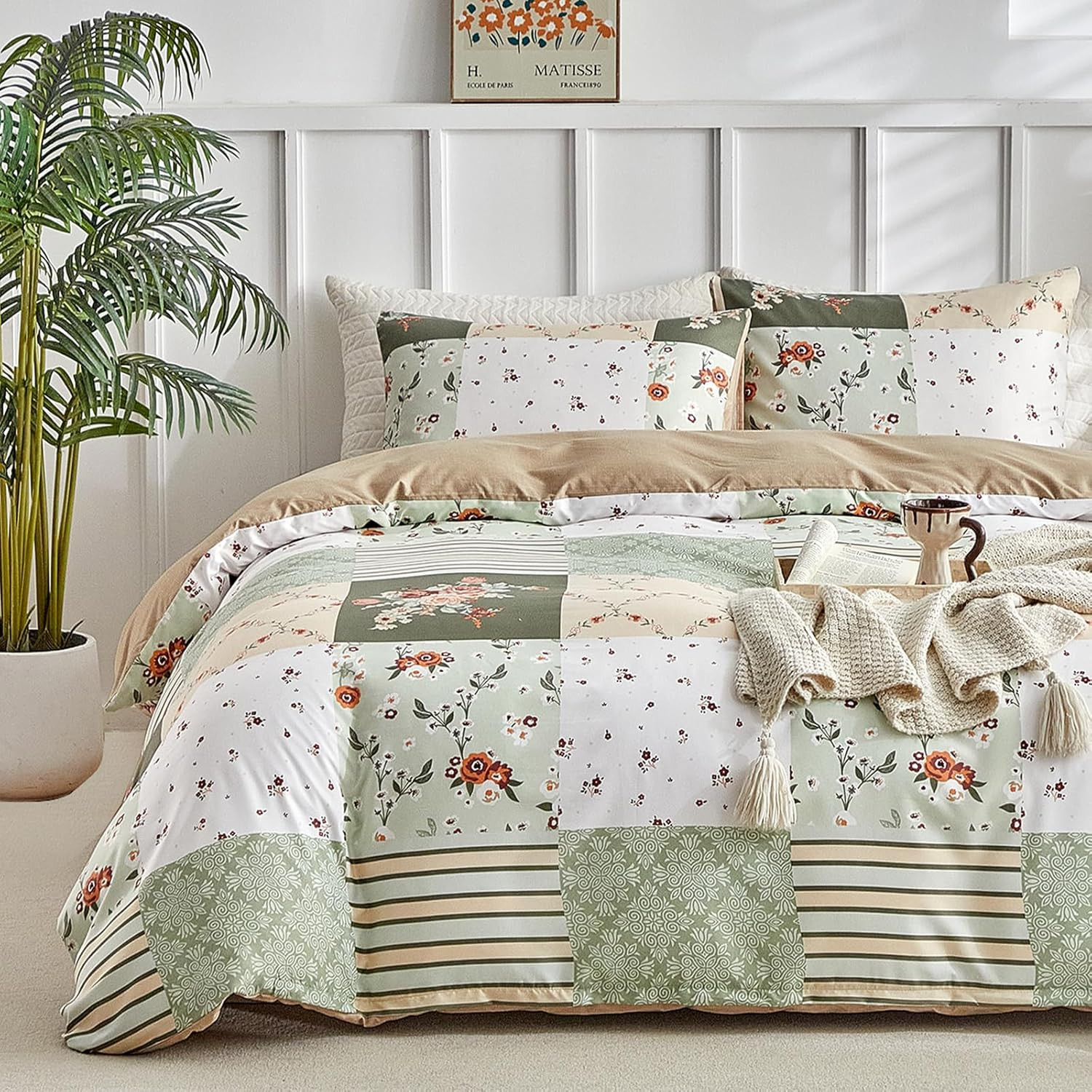 Queen Size Duvet Cover Set, Patchwork Floral 3 Pieces Reversible Duvet Green Cov