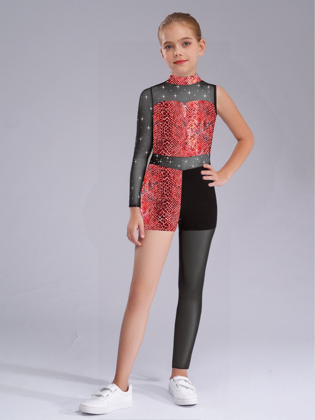 Kids Girls Leotard Dance Costume Mesh Bodysuit Patchwork Rhinestones Training