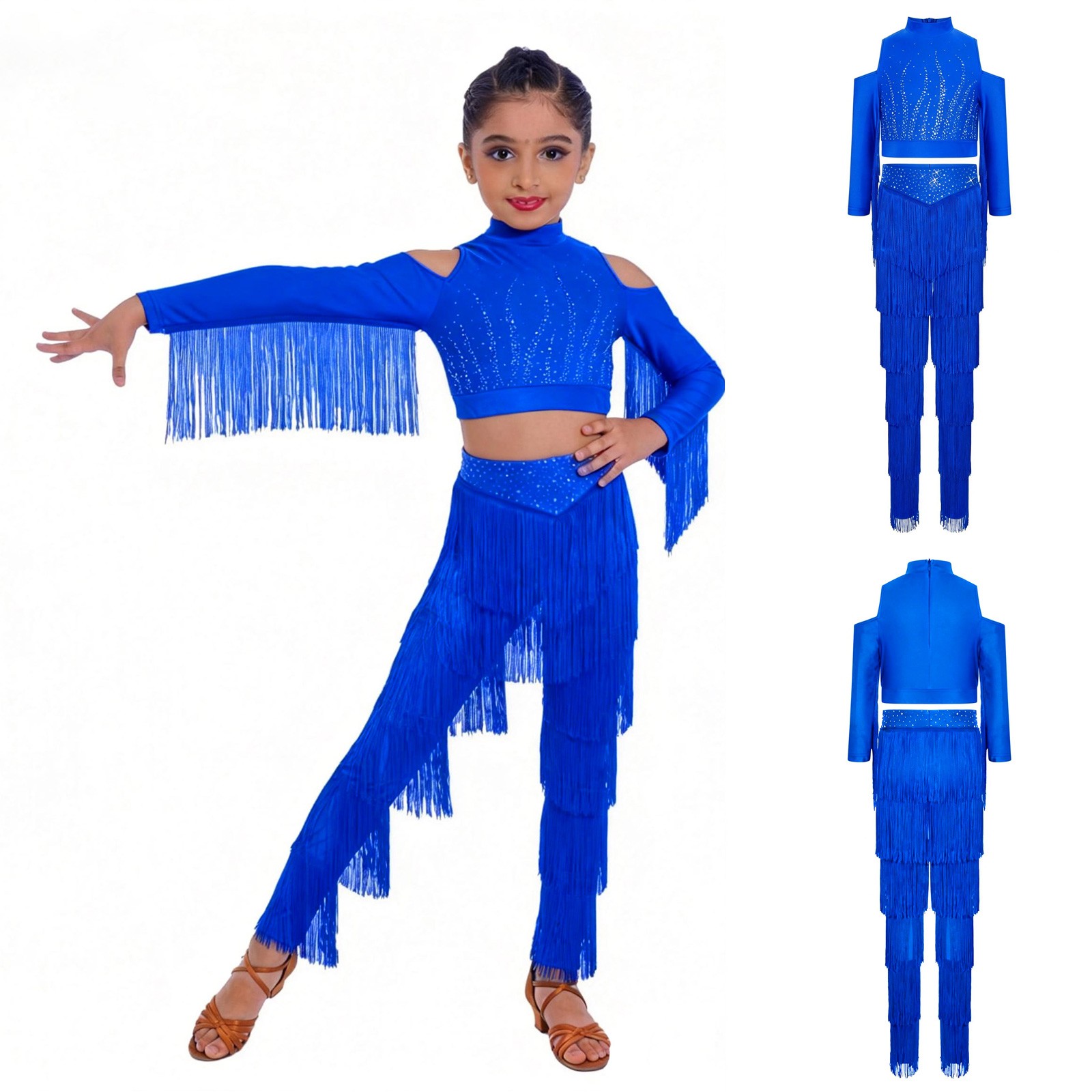 US Kids Girls Latin Jazz Salsa Ballroom Dance Tassel Crop Tops with Fringe Pants