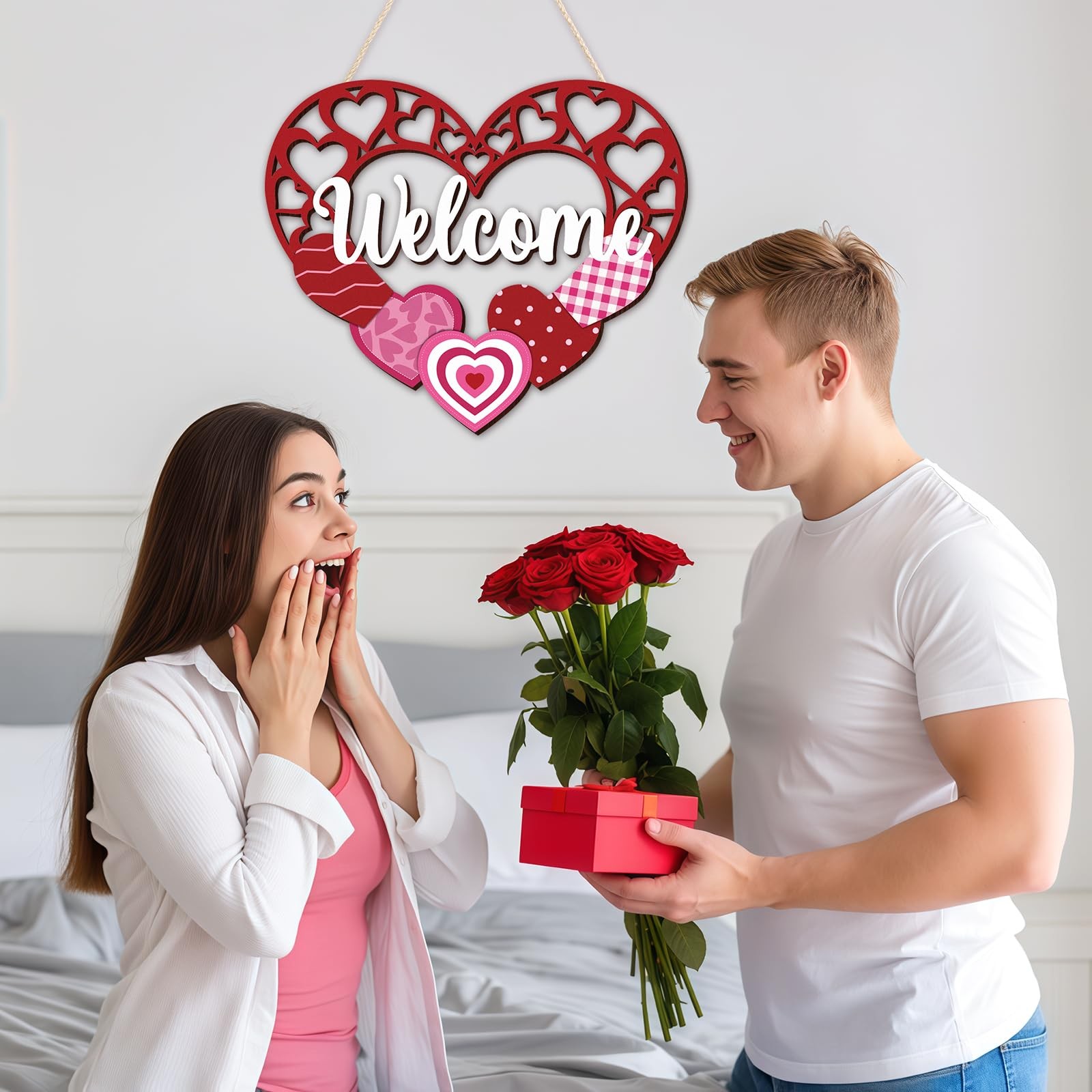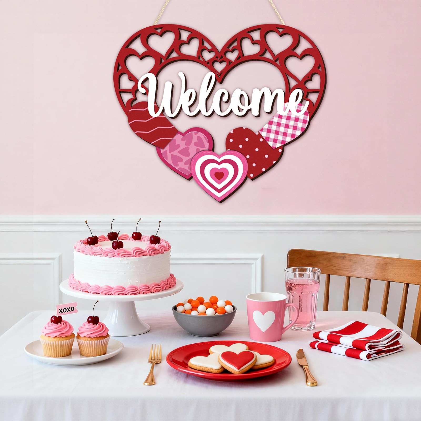 Valentines Day Welcome Door Sign, Wooden Love Red Pink Heart Valentines Day D...
