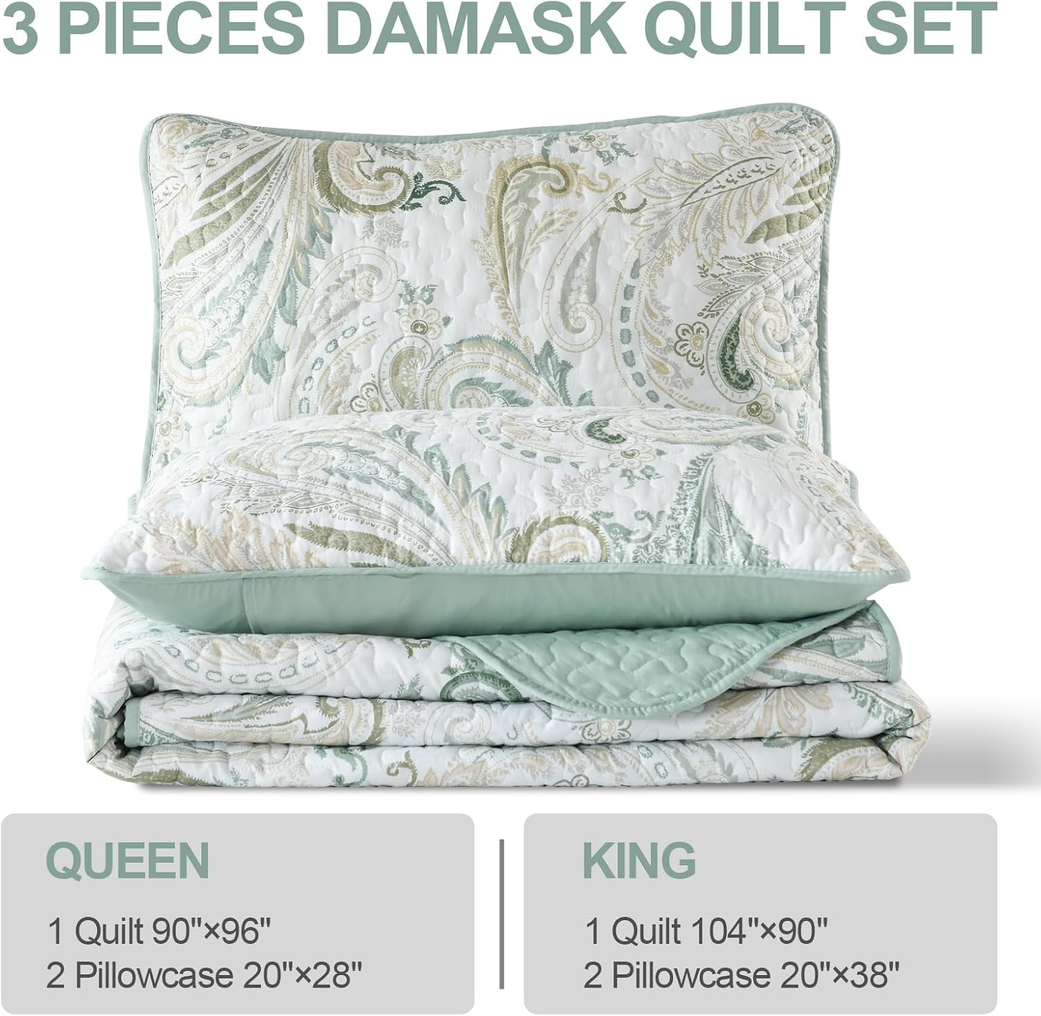 Boho Quilt Set King,Sage Green Paisley Floral Pattern Bedspread Coverlet Set wit