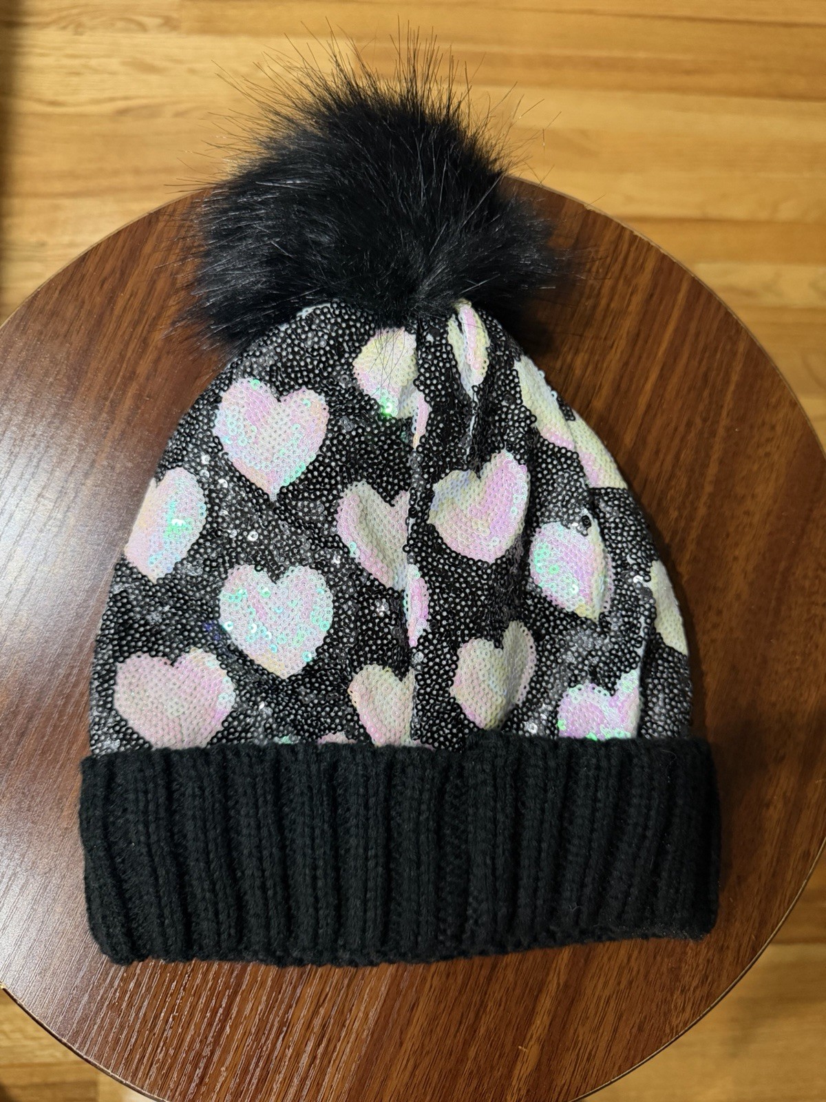 Justice Black Knit Pom Beanie Iridescent Pink Hearts