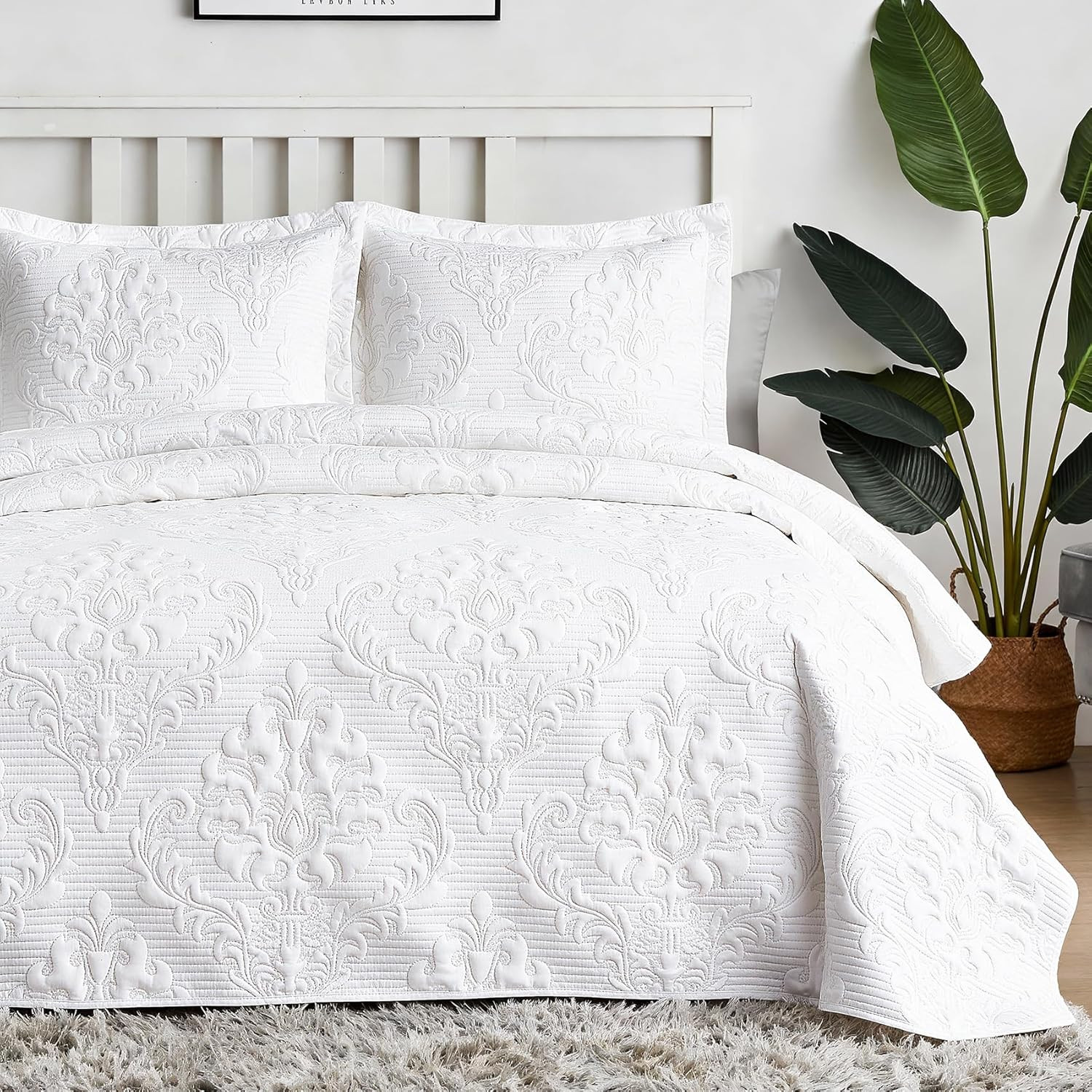 White Quilt Queen Size - Damask Ultrasonic Summer Bedspread Queen, Soft Lightwei