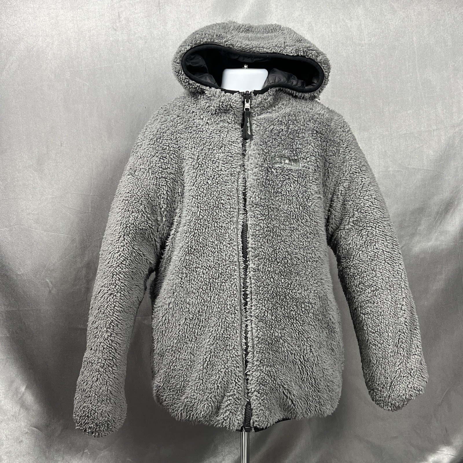 Eddie Bauer Down Hooded Kids Jacket Reversible Unisex Sz Med 10/12 Black Gray