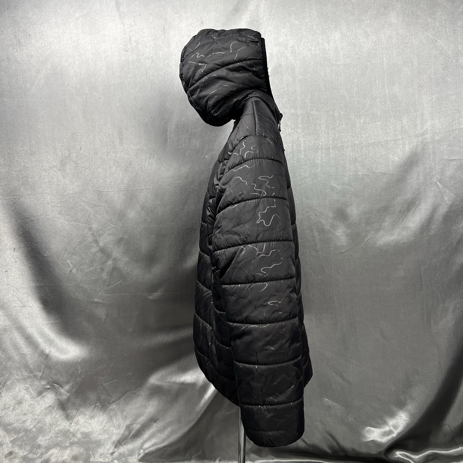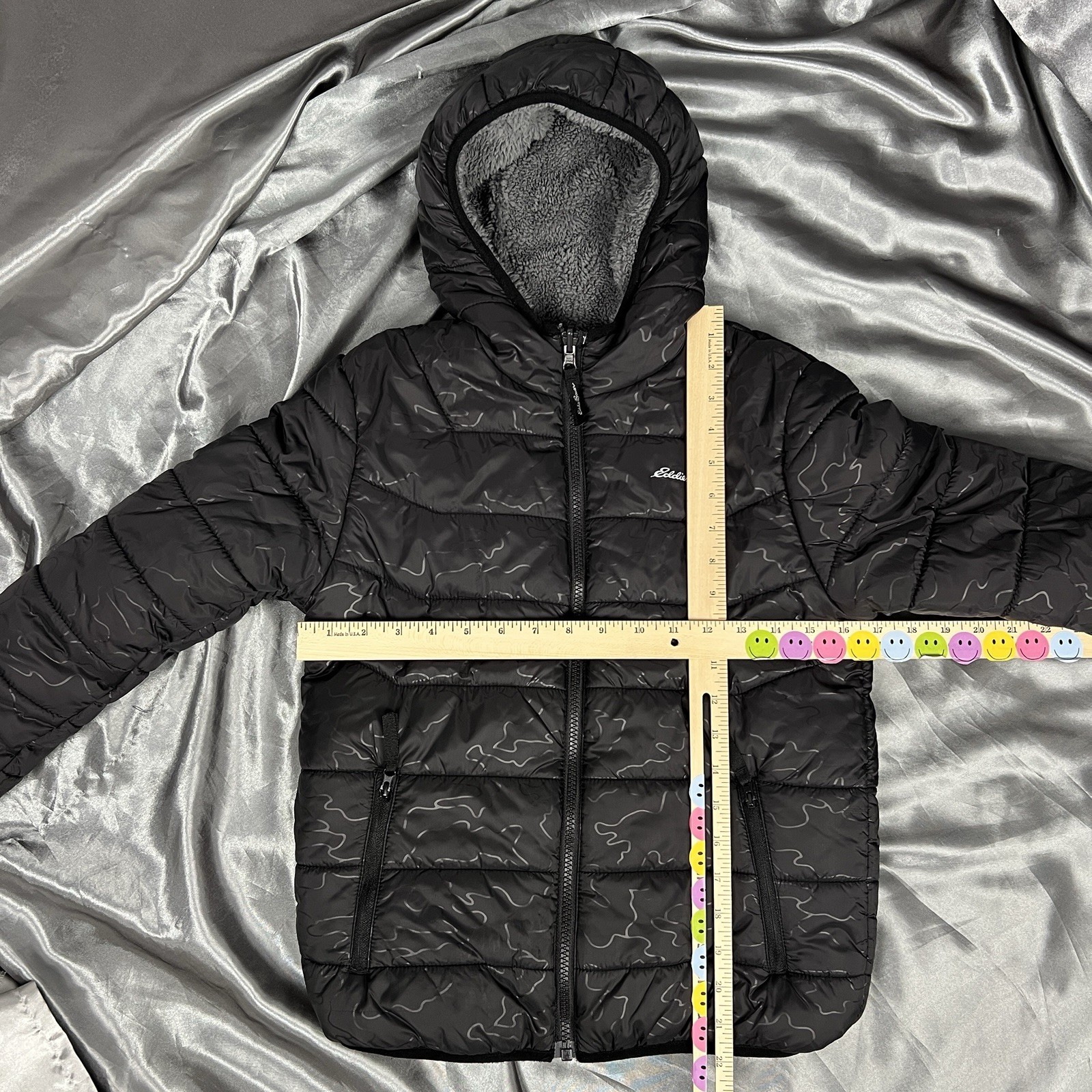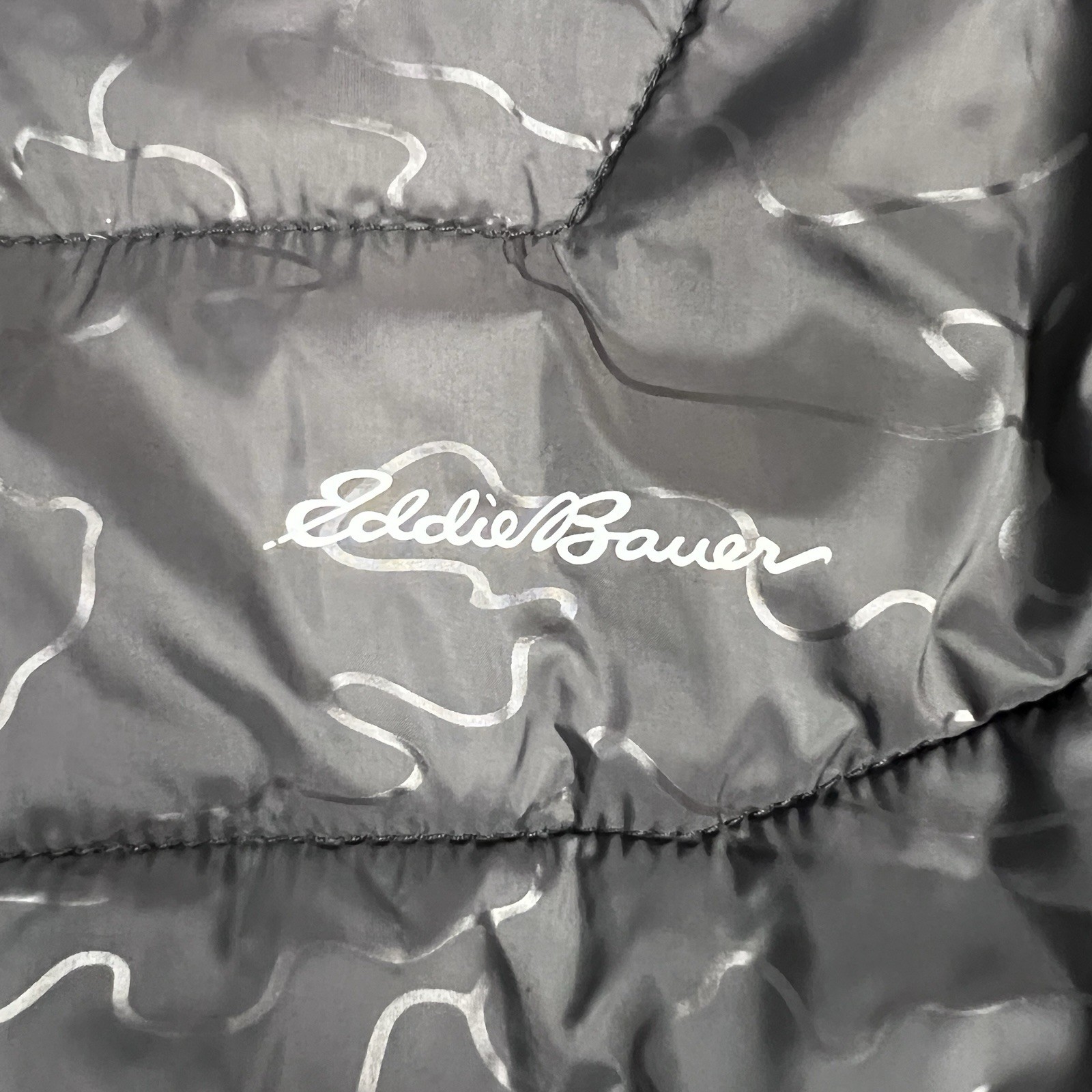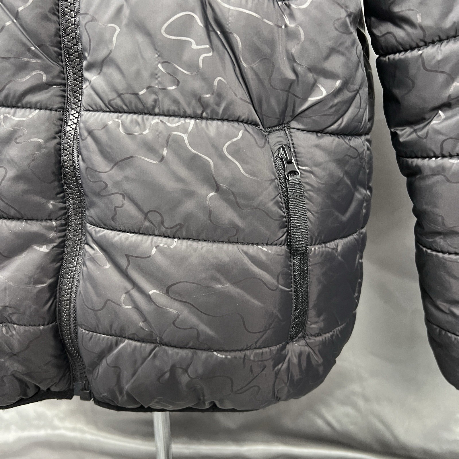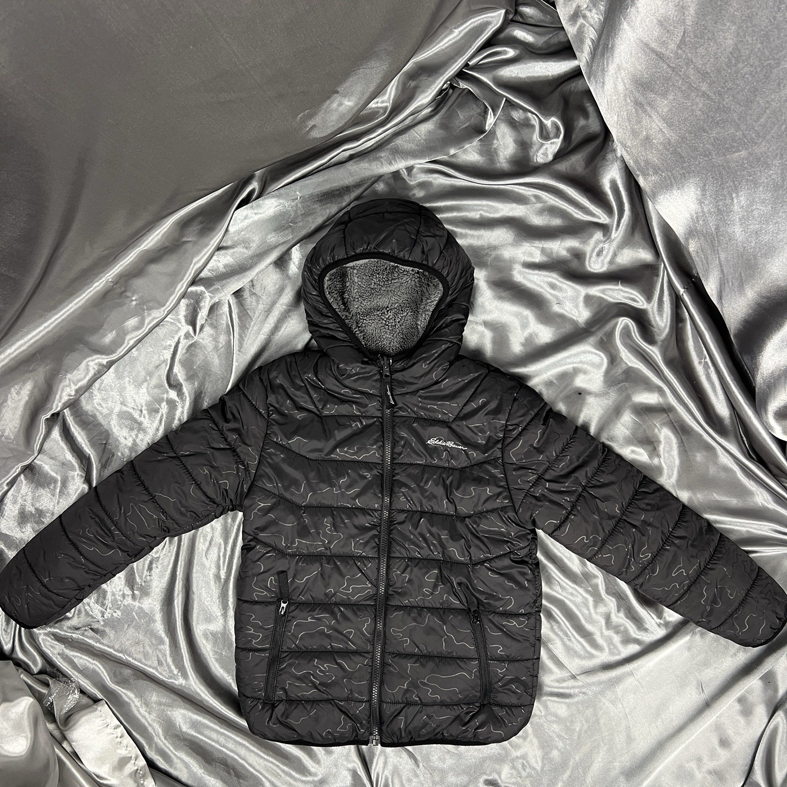 как выглядит Eddie Bauer Down Hooded Kids Jacket Reversible Unisex Sz Med 10/12 Black Gray фото