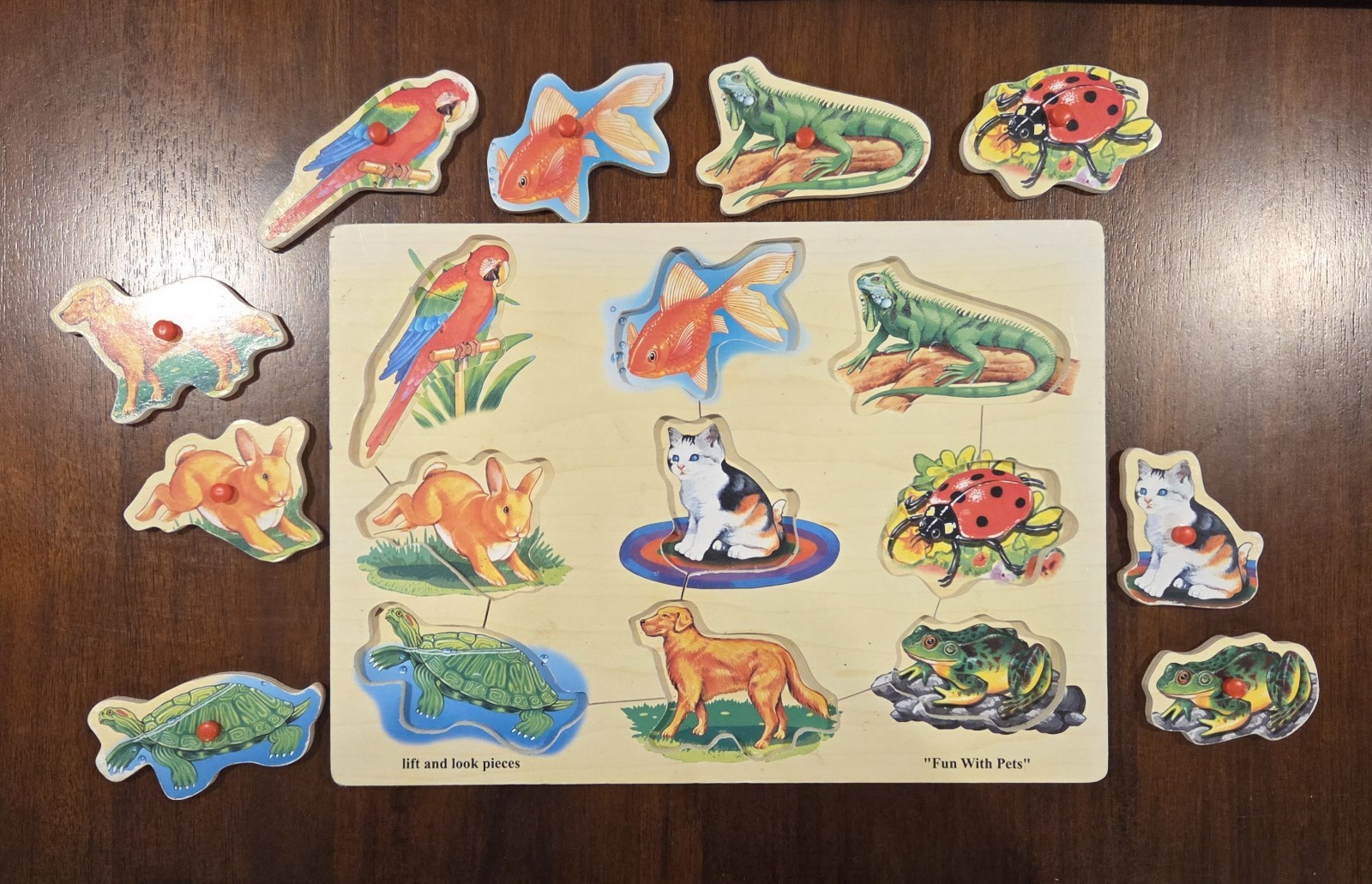 Wooden Peg Puzzle Fun With Pets Toddlers Kids Vintage Lift and Look Pieces