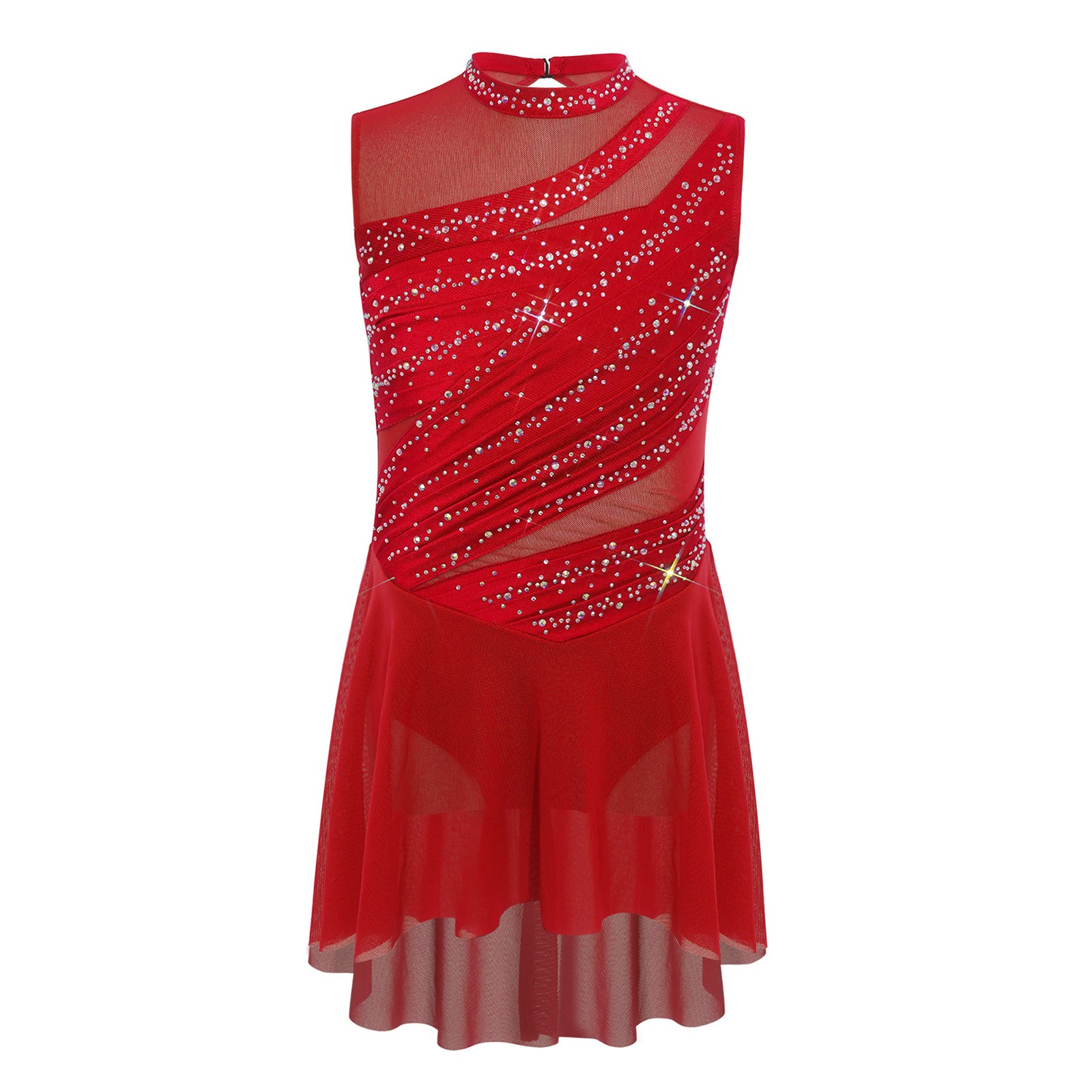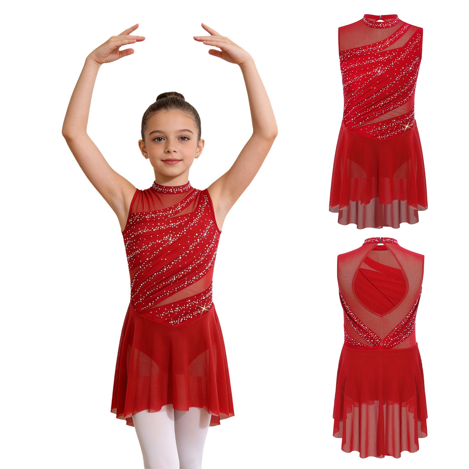 Girls Lyrical Dance Sheer Mesh Ballet Skirted Leotard Rhinestone Skating Dress