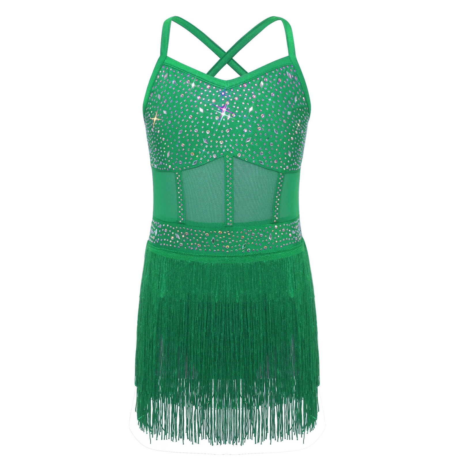 Girls Figure Skating Skirted Leotard Crisscross Tassels Latin Tango Dance Dress