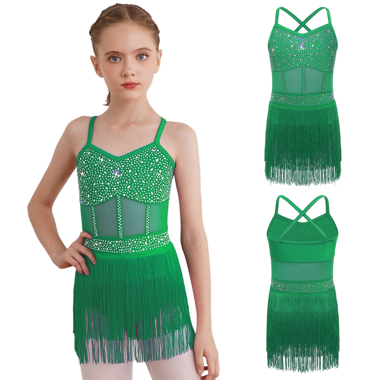 как выглядит Girls Figure Skating Skirted Leotard Crisscross Tassels Latin Tango Dance Dress фото