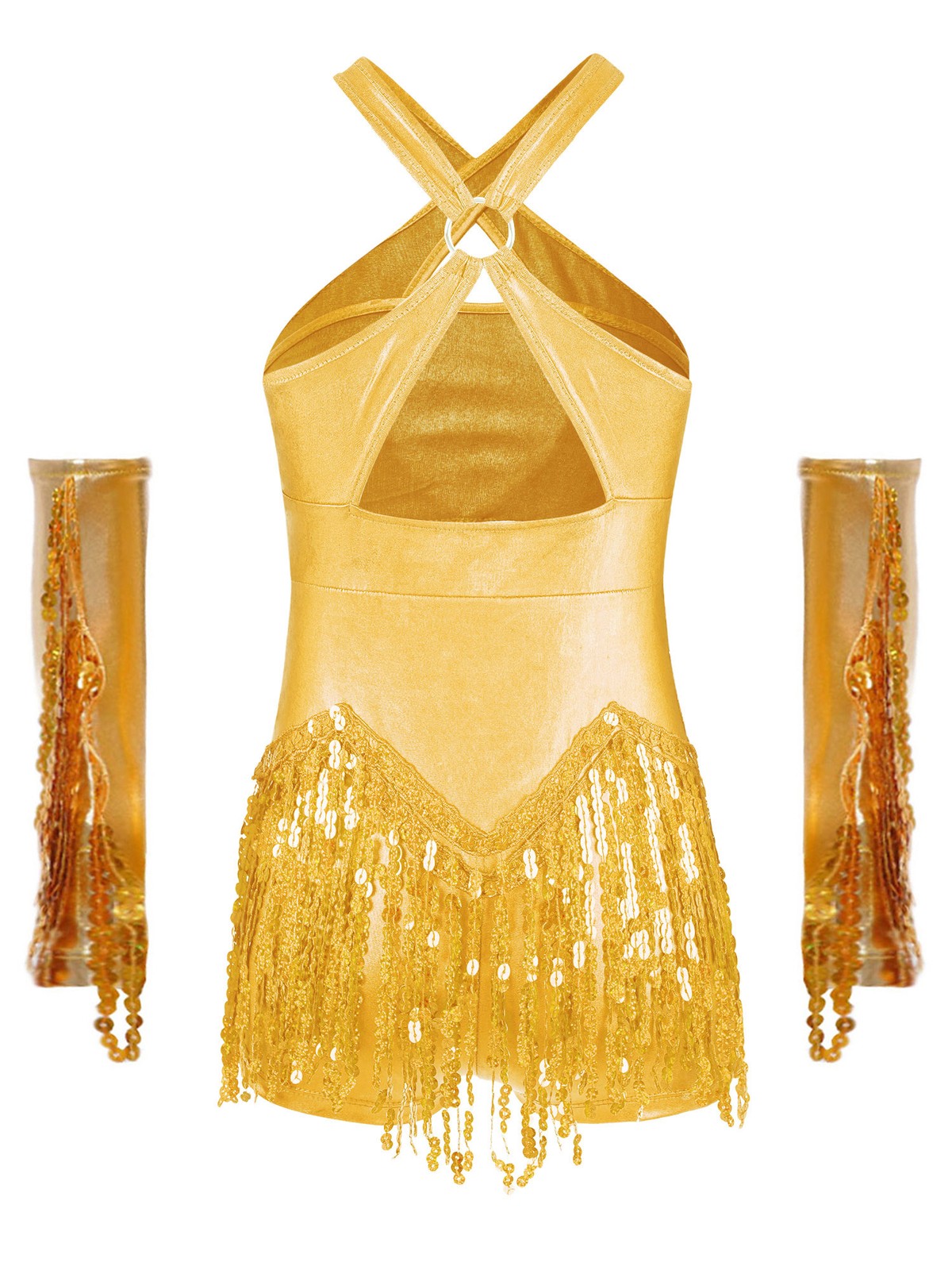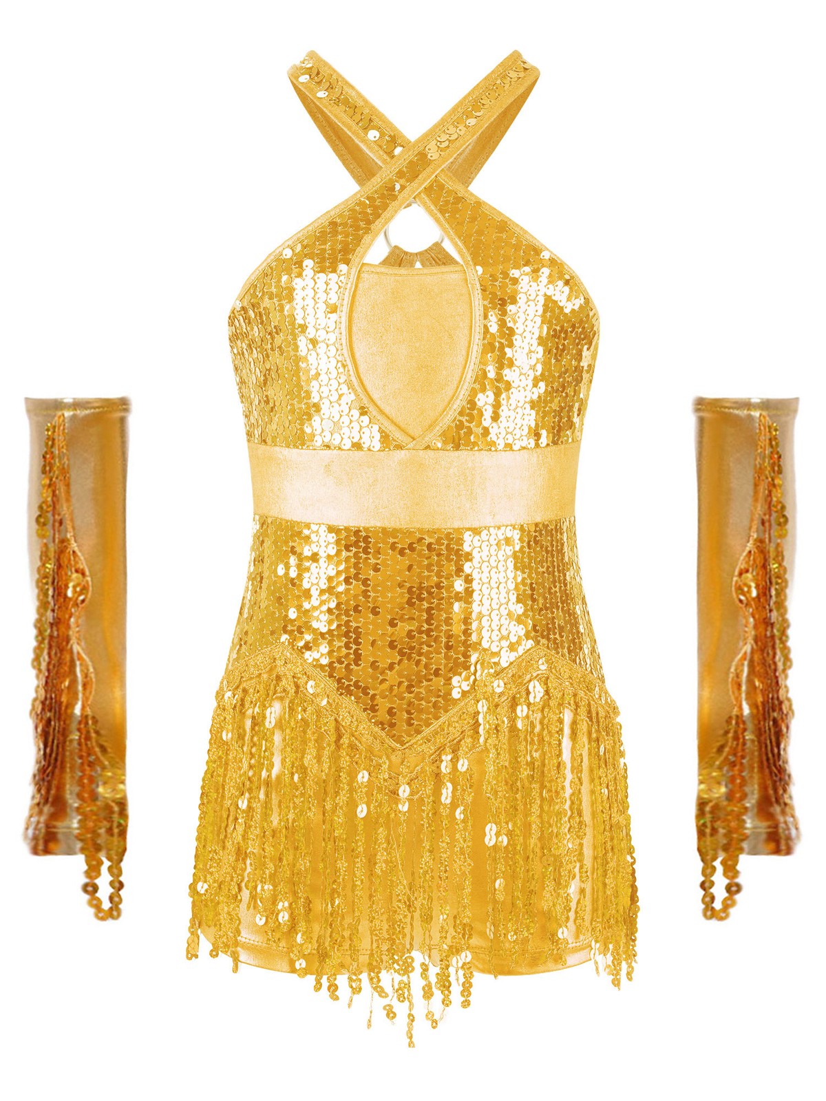 US Kids Sequins Tassel Hem Latin Dance Dress Skirted Leotard Dress With Gloves