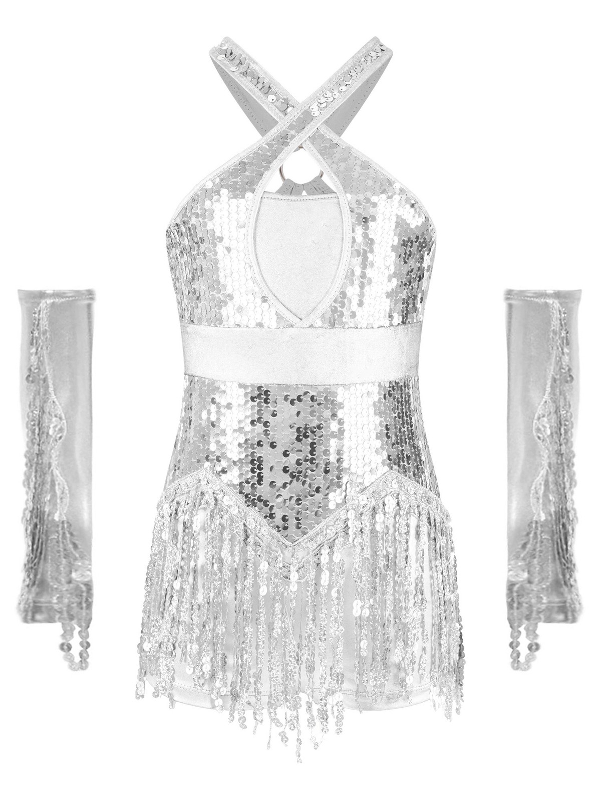 US Kids Sequins Tassel Hem Latin Dance Dress Skirted Leotard Dress With Gloves