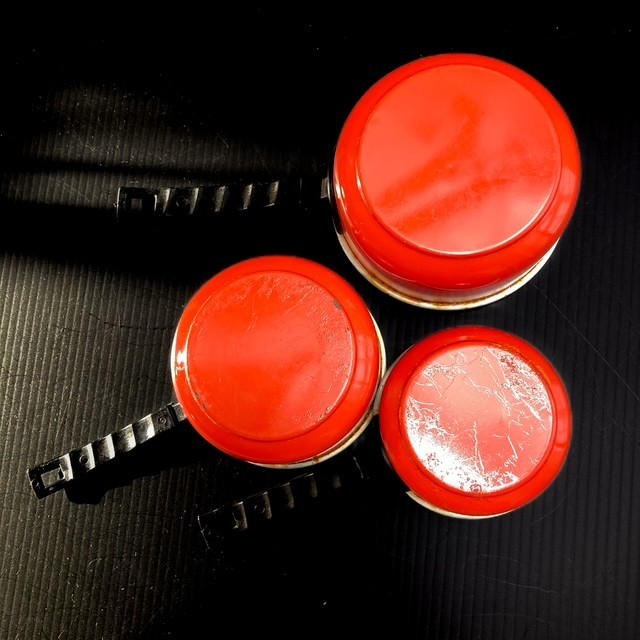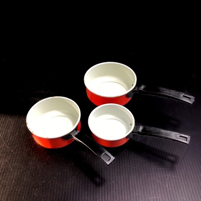• Miniature Red Enamel Style Toy Cookware Dollhouse Kitchen Toy Display with wear
