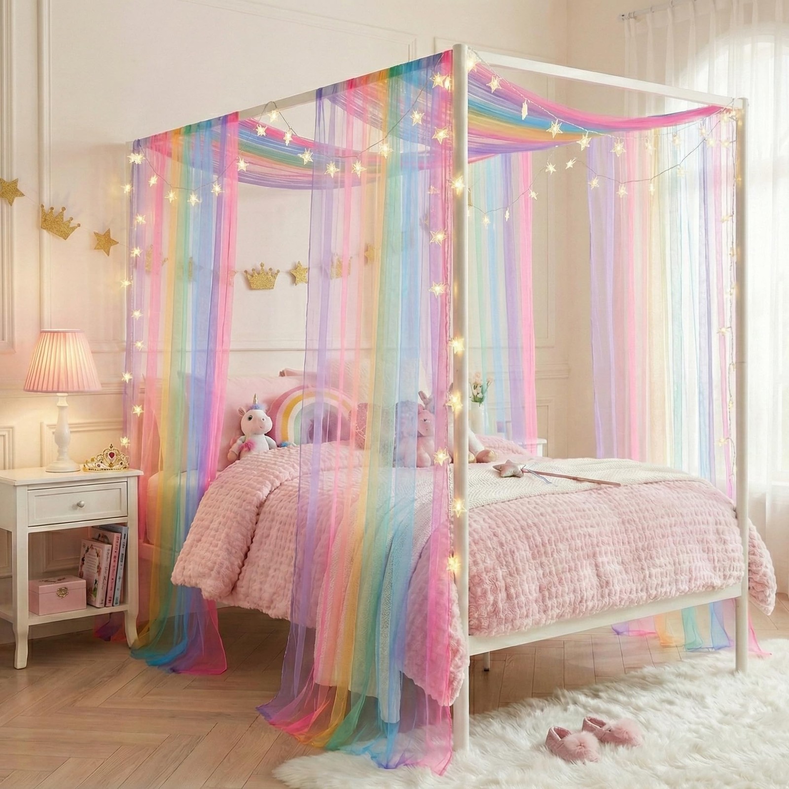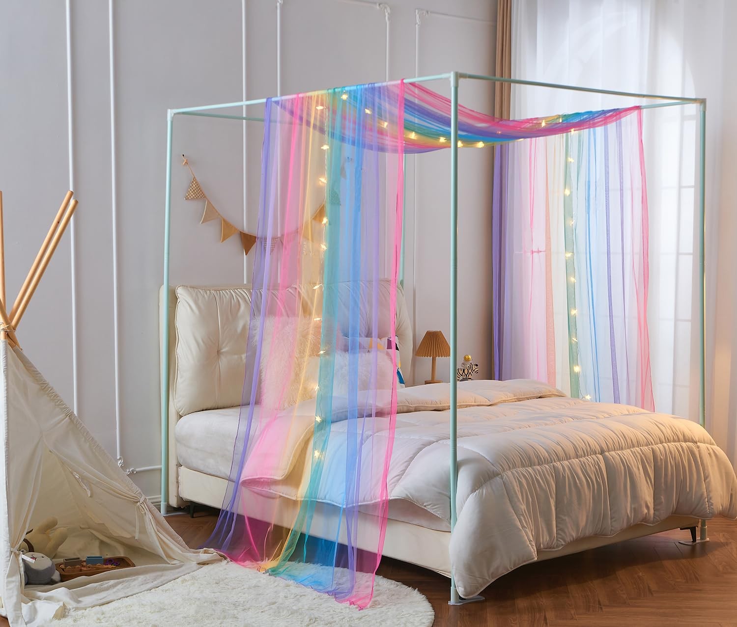 House Bed Canopy for Girls, Rainbow Curtains Twin with Lights, Princess Sheer