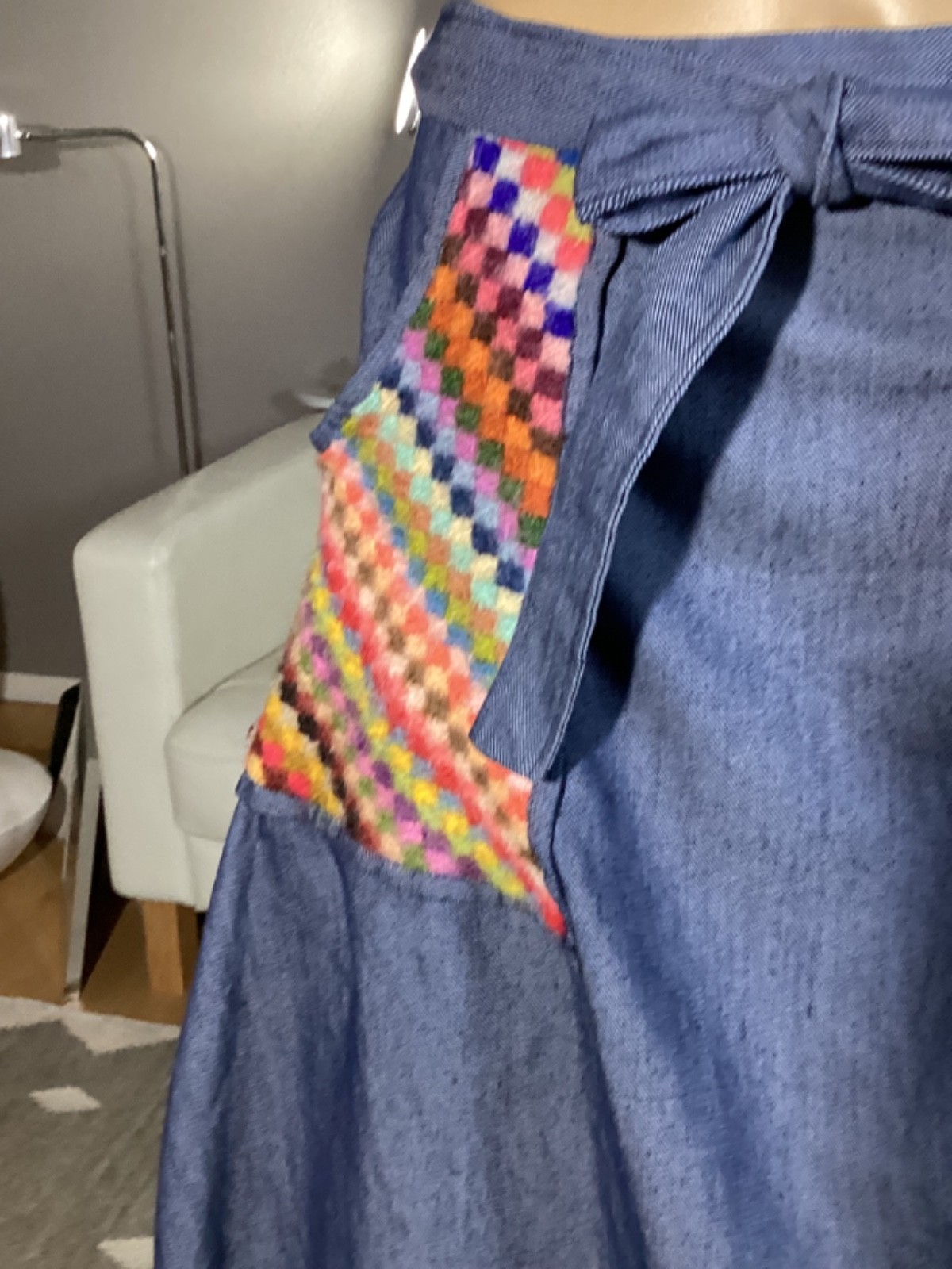 как выглядит Vintage 1970s Denim Wrap Midi Skirt Hippie Boho Picnic Colorful Knit Pockets фото