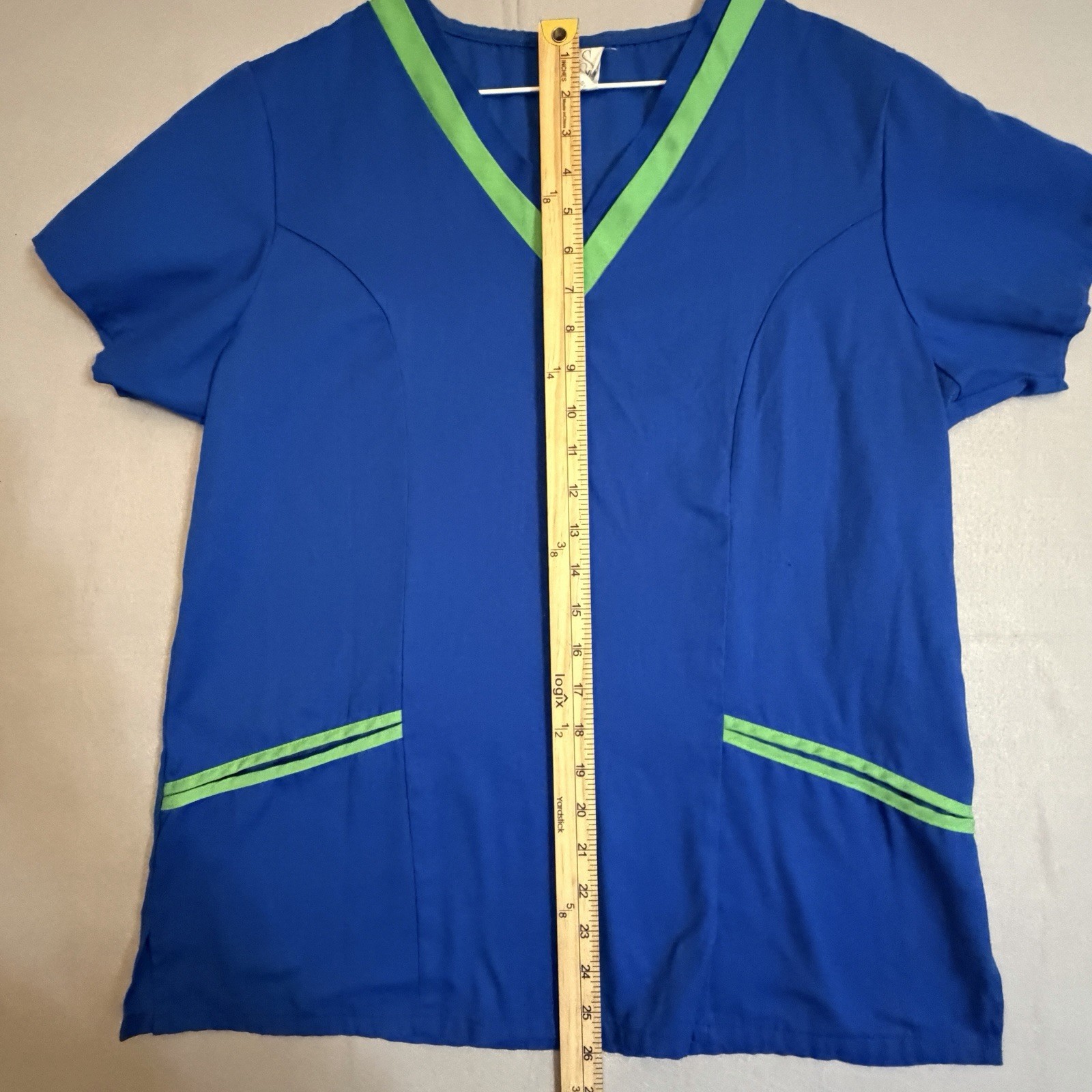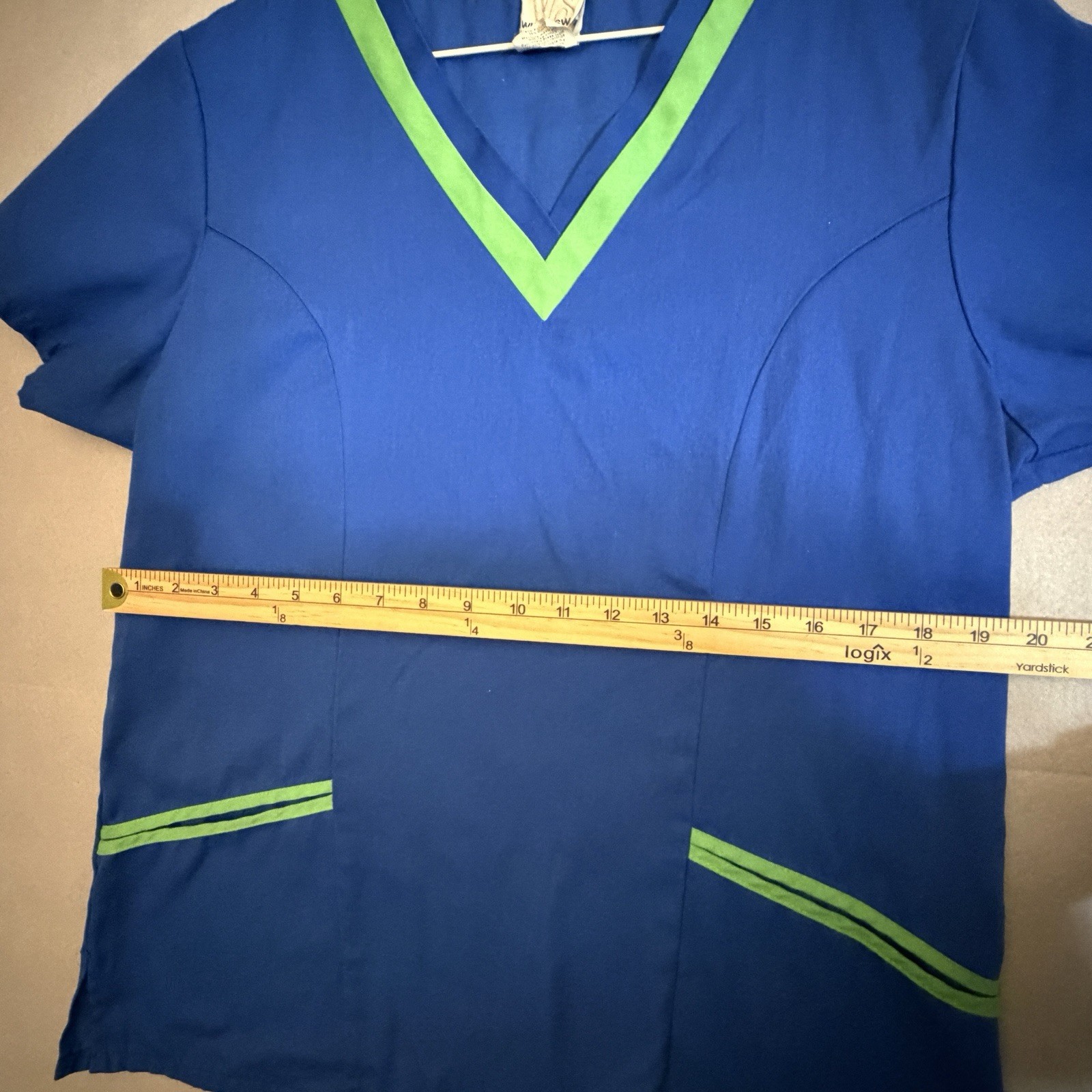 как выглядит White Swan Medical Scrubs Shirt Womens Medium Top Blue With Lime Green Pockets фото