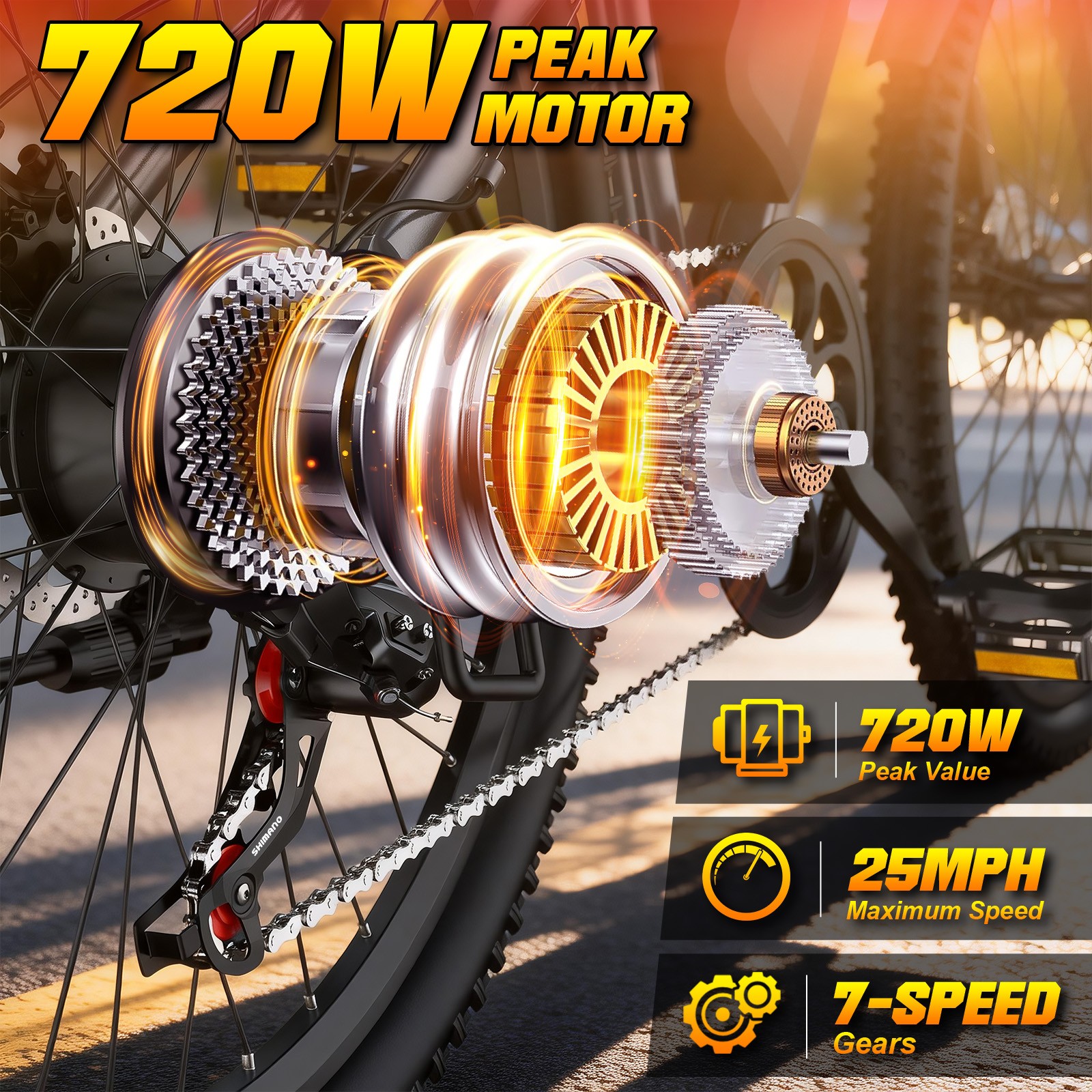 720W Electric Bike for Adults, 26 Tires, 25MPH, 50Mile, 7-Speed, Dual Brakes US