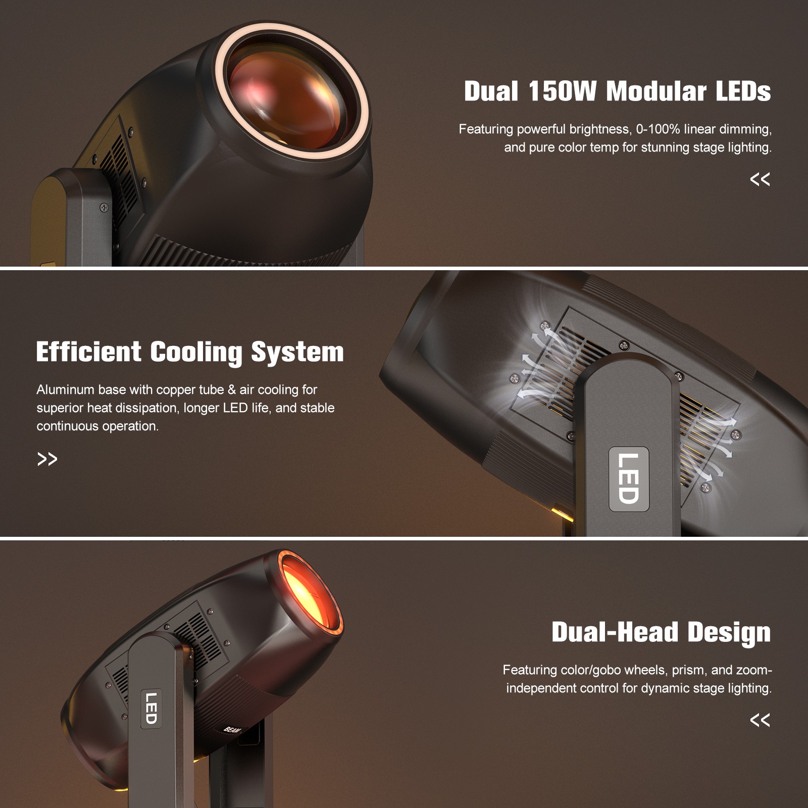 Light source: 2 200W module LEDs + 24 0.2W (RGB) LEDs*2
