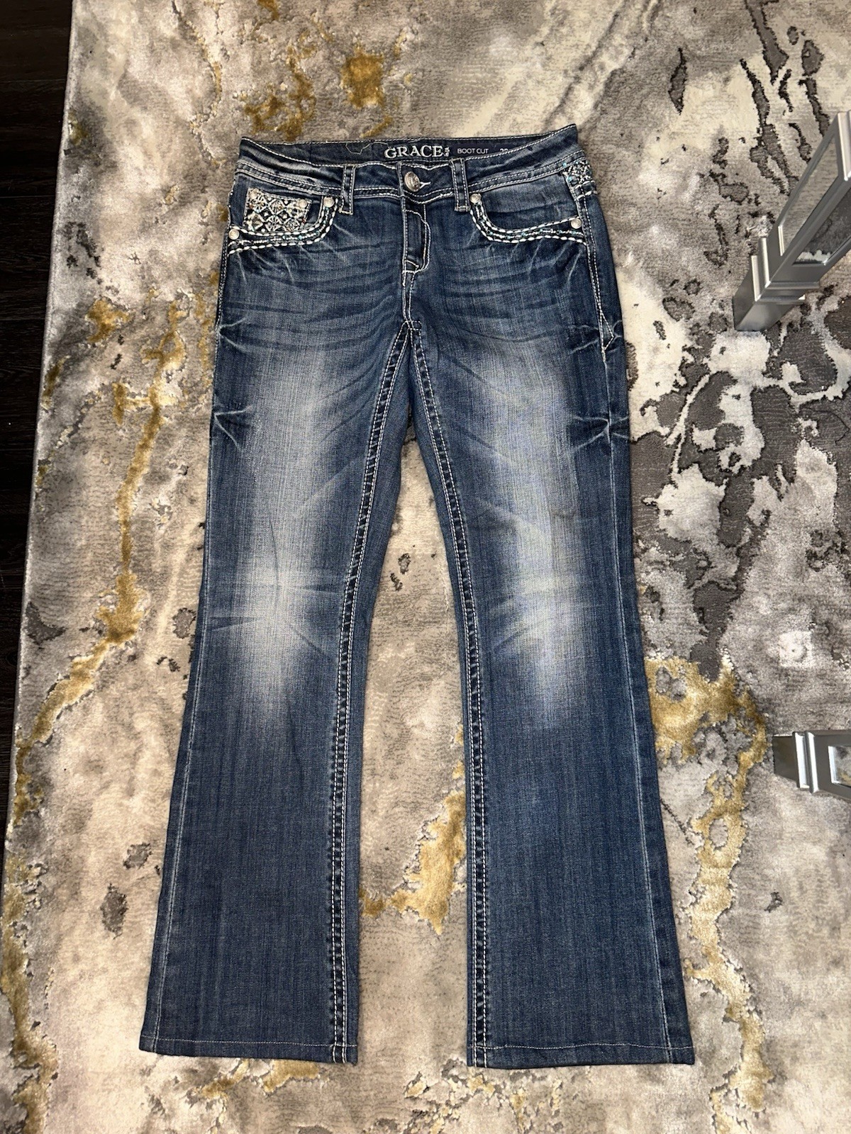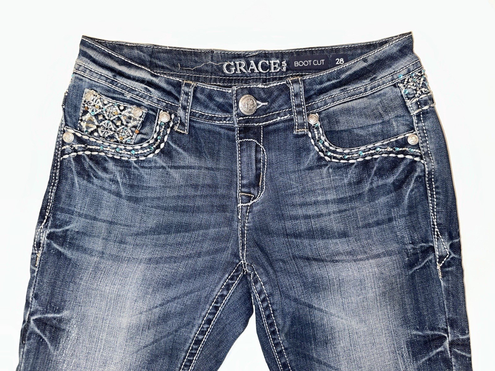 Grace In LA Women's Blue Bootcut Jeans Medium Wash Embellished Rhinestone Denim