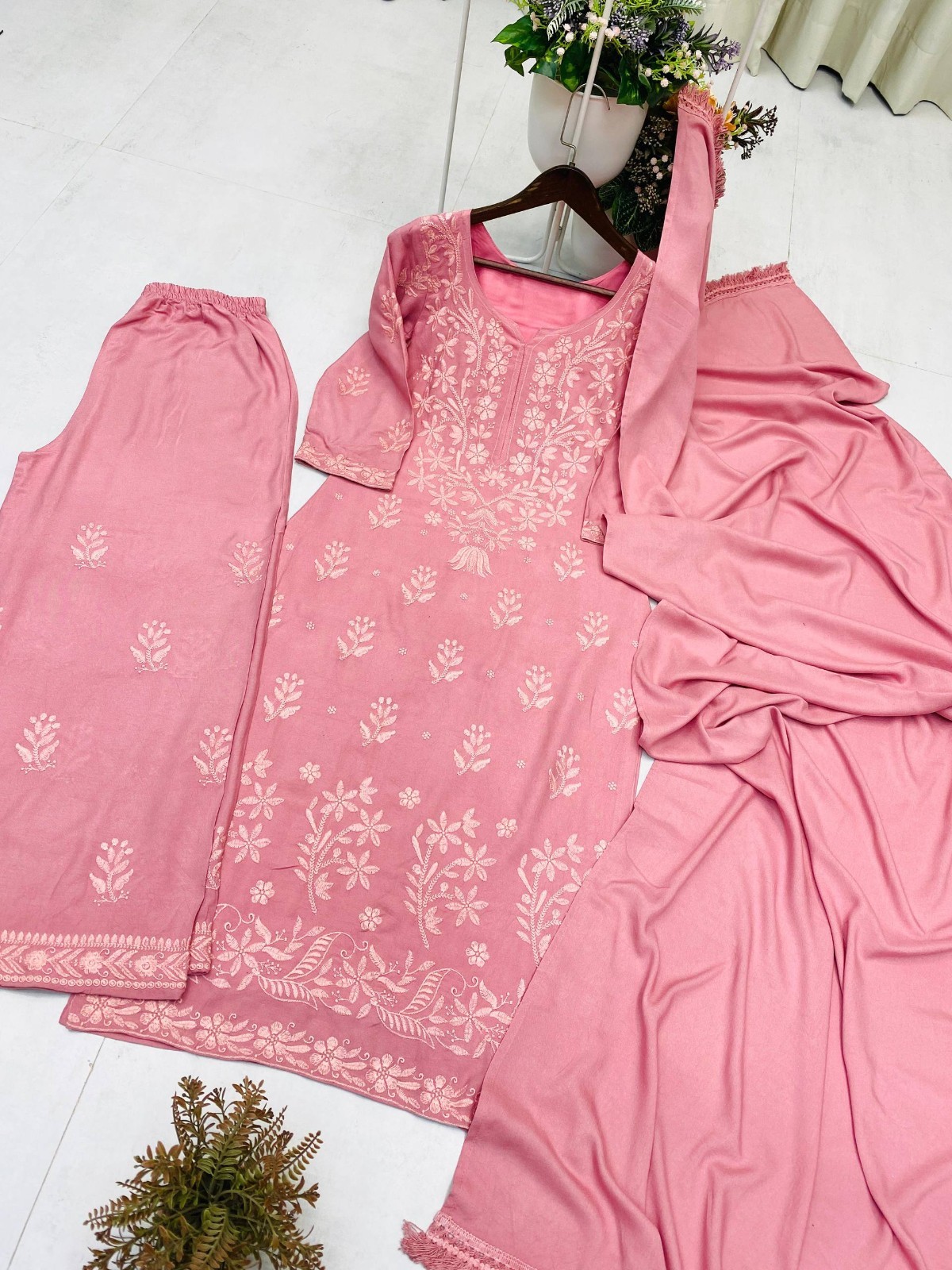 как выглядит Dusty Pink Kurta Palazzo Set Embroidered Rayon Ethnic Suit Dupatta Set For Women фото