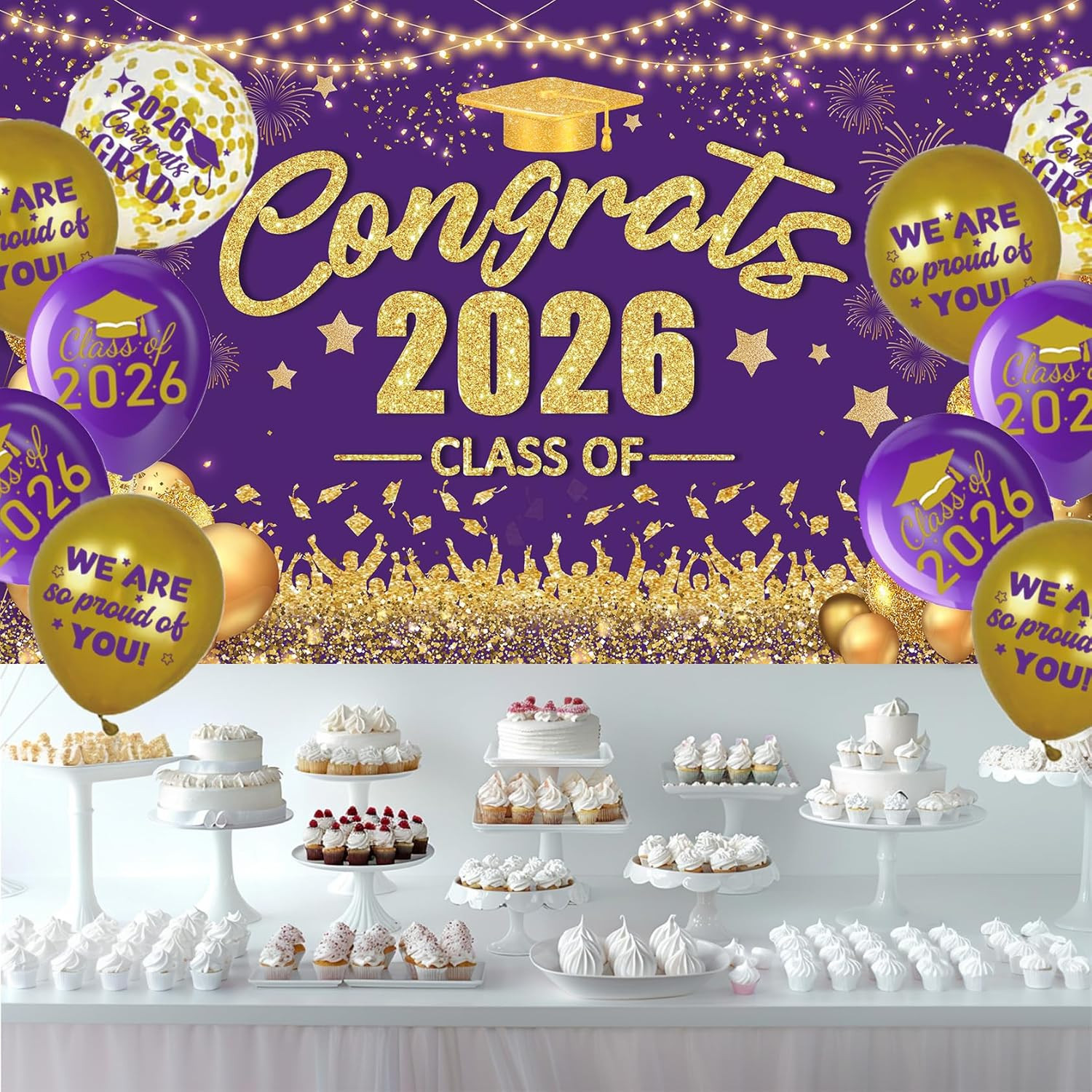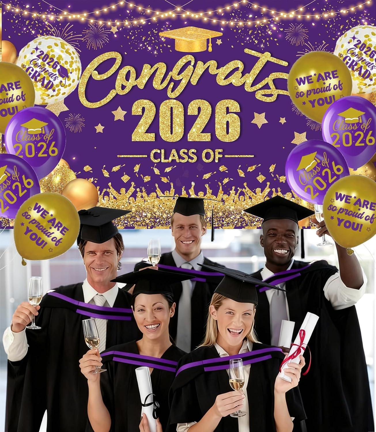Purple and Gold Graduation Decorations Class of 2026 Banner with 18 Pcs Grad Bal