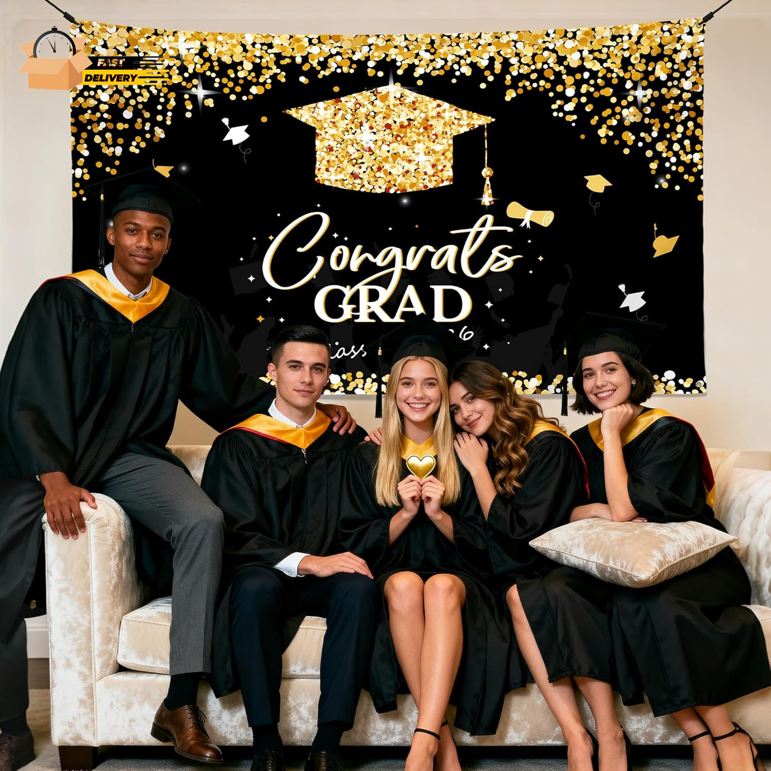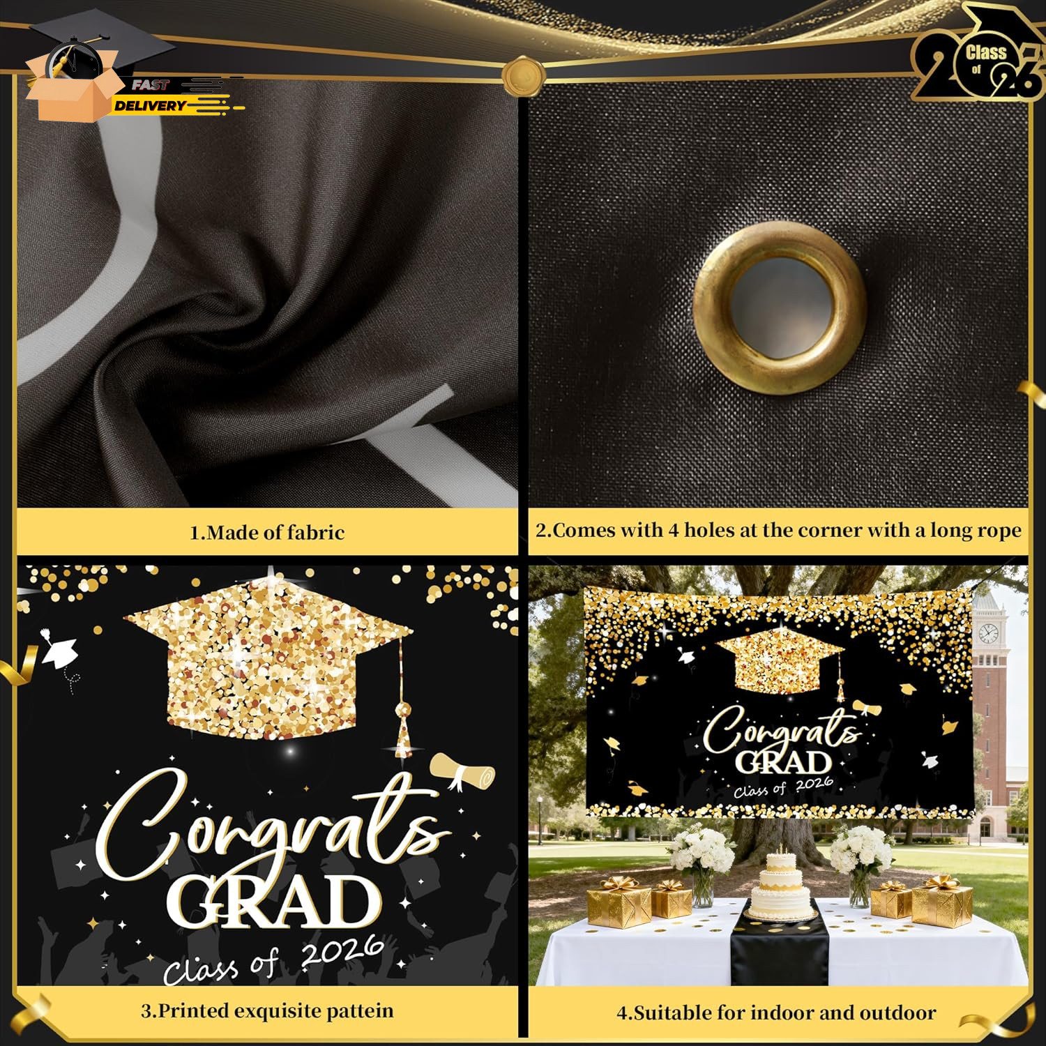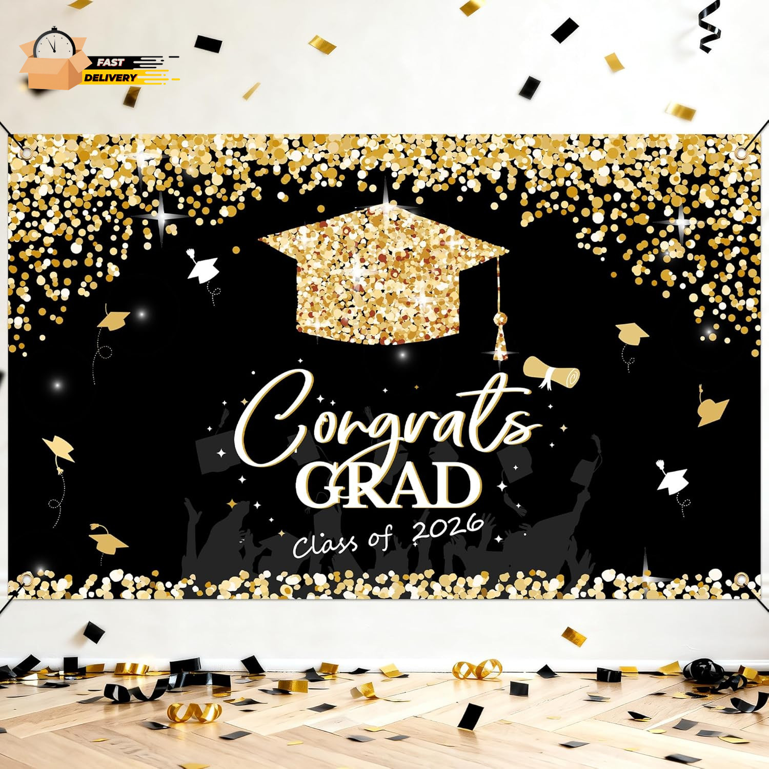 Graduation Decorations 2026 - Black and Gold Graduation Backdrop and Congrats G