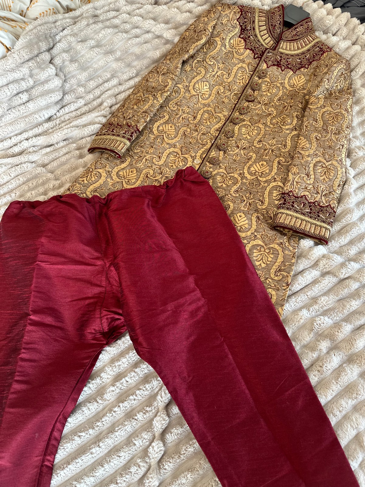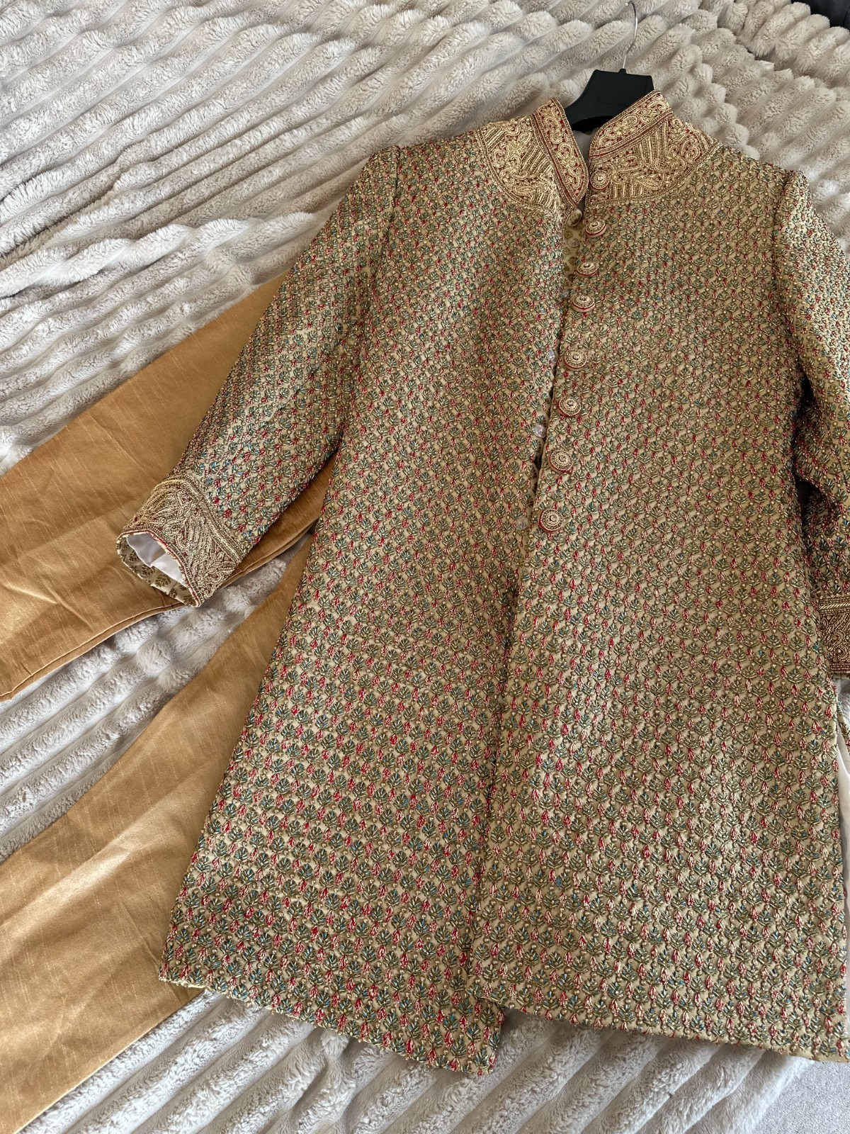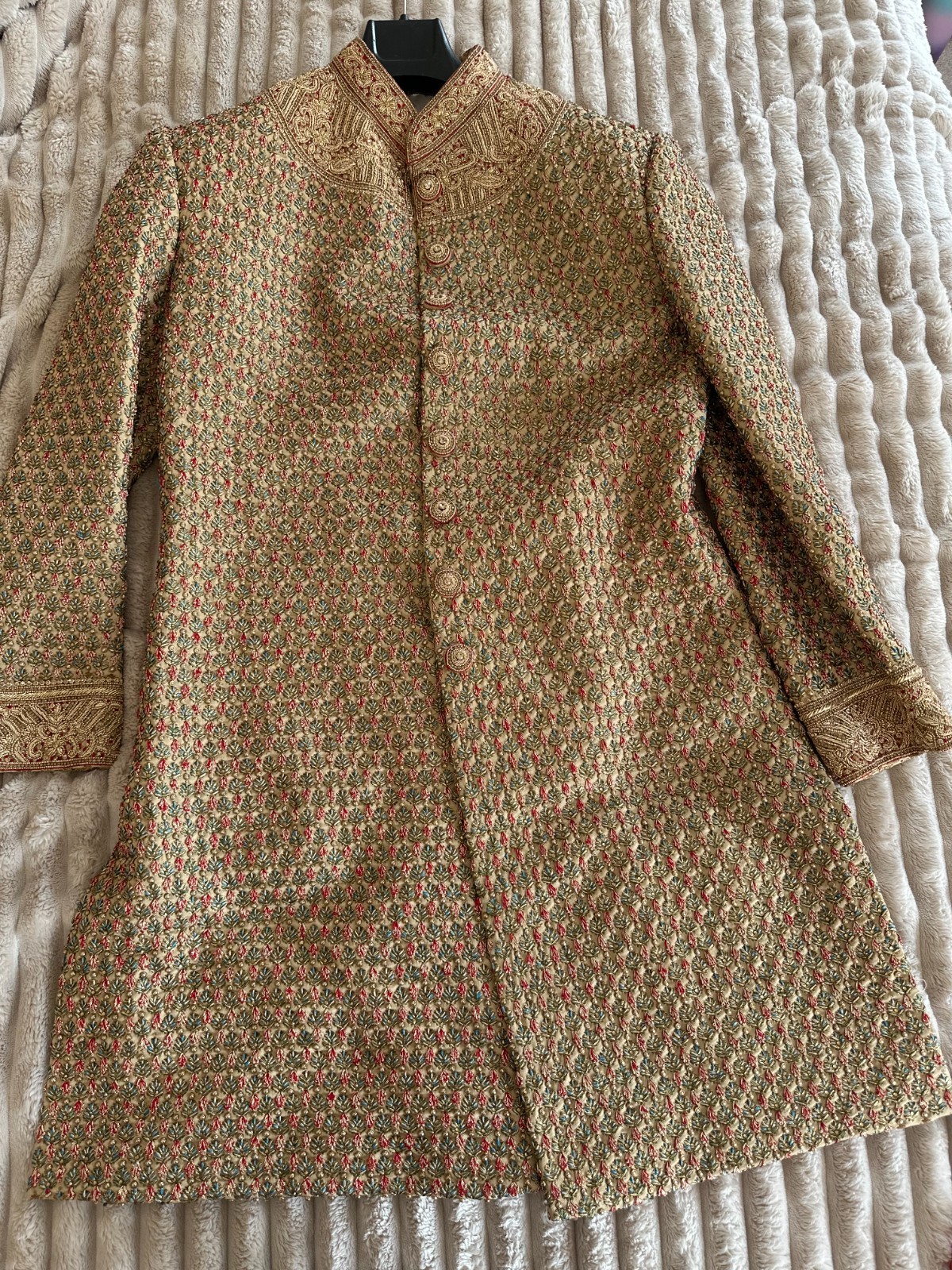 как выглядит Mens Wedding Sherwani - Indian, Red Gold with Hand Work фото
