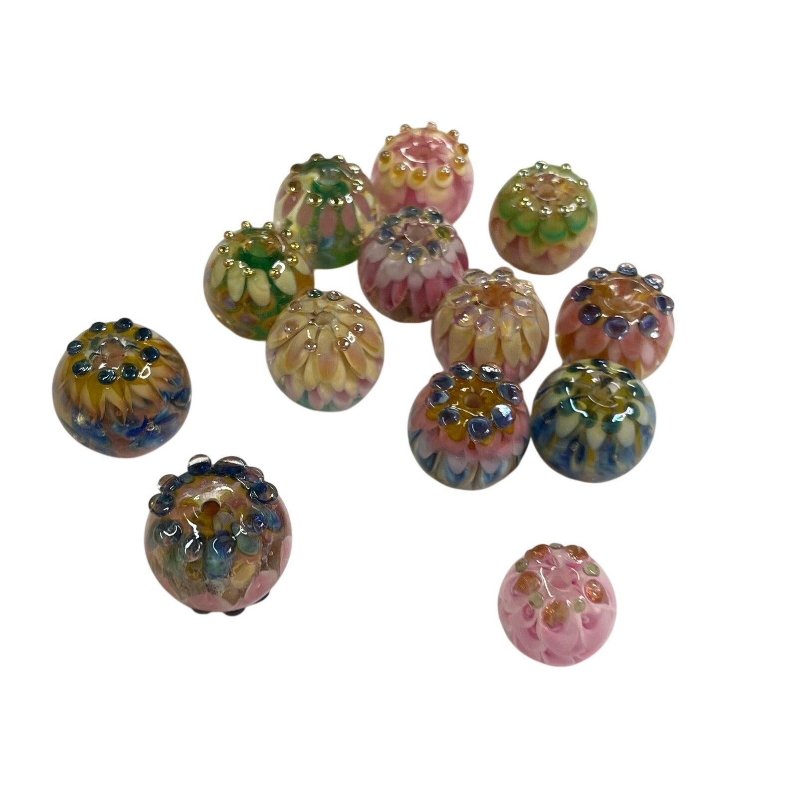 как выглядит Lampwork Handmade Pastel Pink Blue Flower Petal Layered Glass 13 Round Bead Set фото