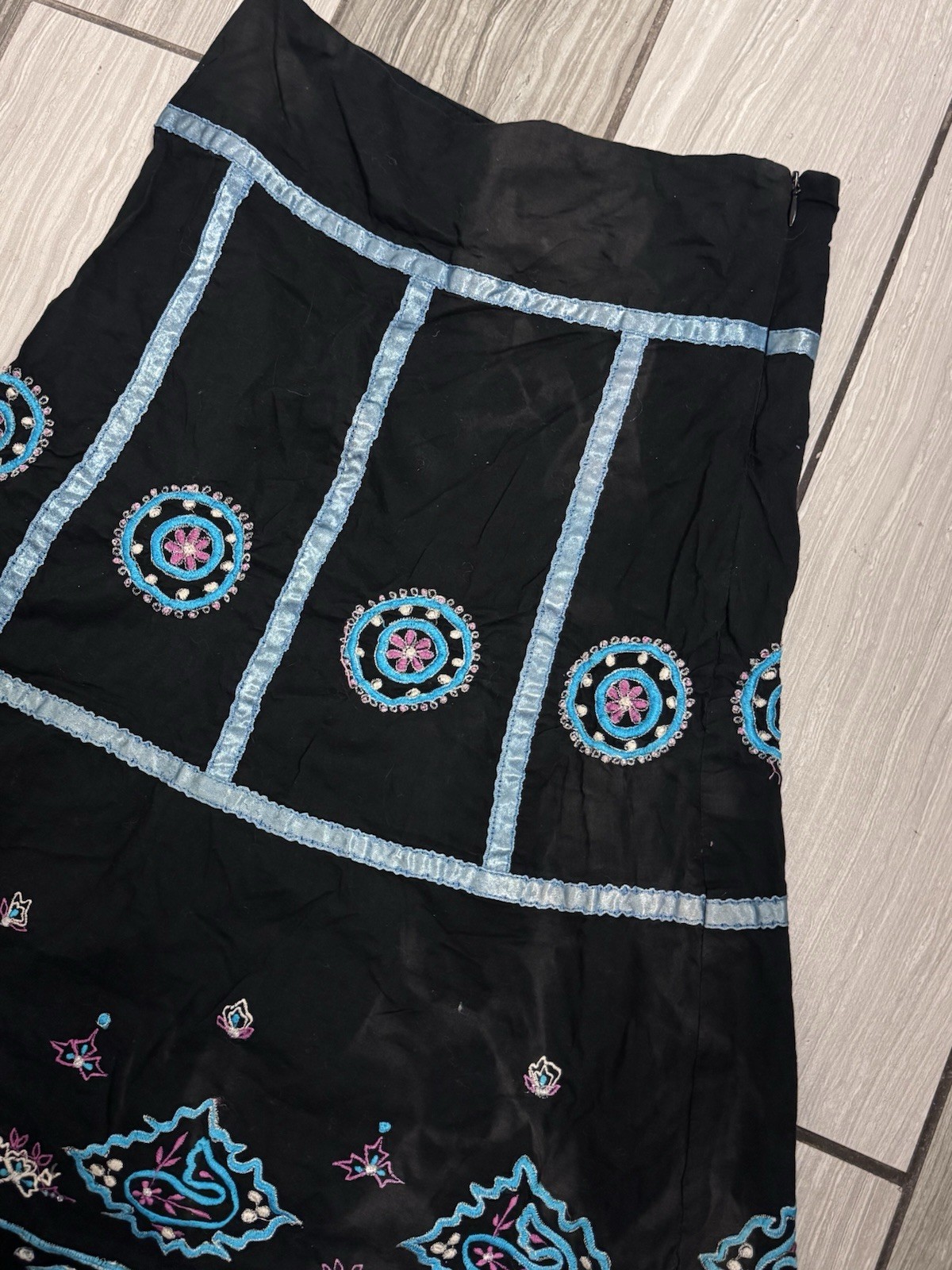 Vtg RAMPAGE 90s Y2K boho black A-line skirt metal embroidery beads ribbon USA 9