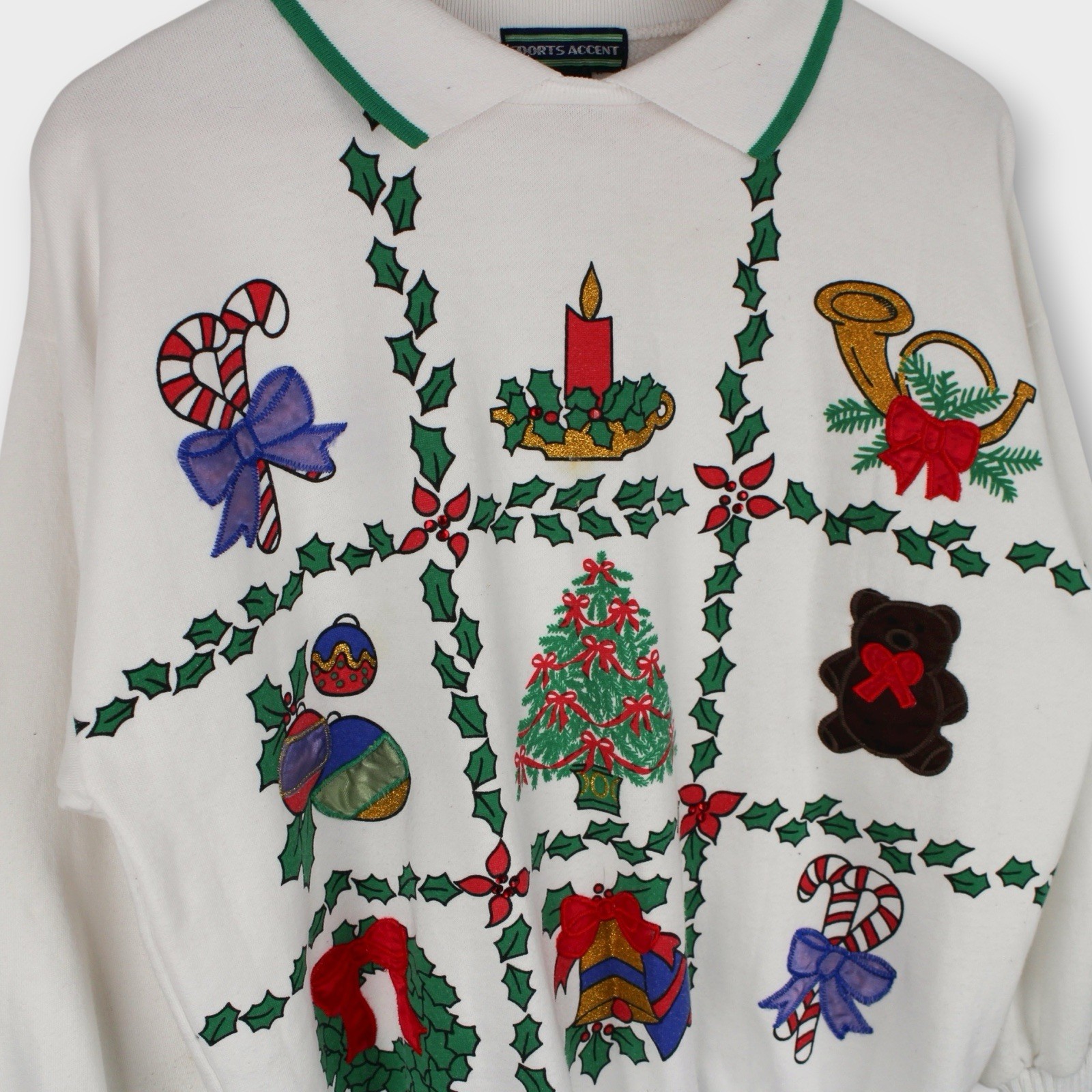 Vintage Christmas Sweatshirt Holiday Collared Embroidered Teddy Bear 90s Small