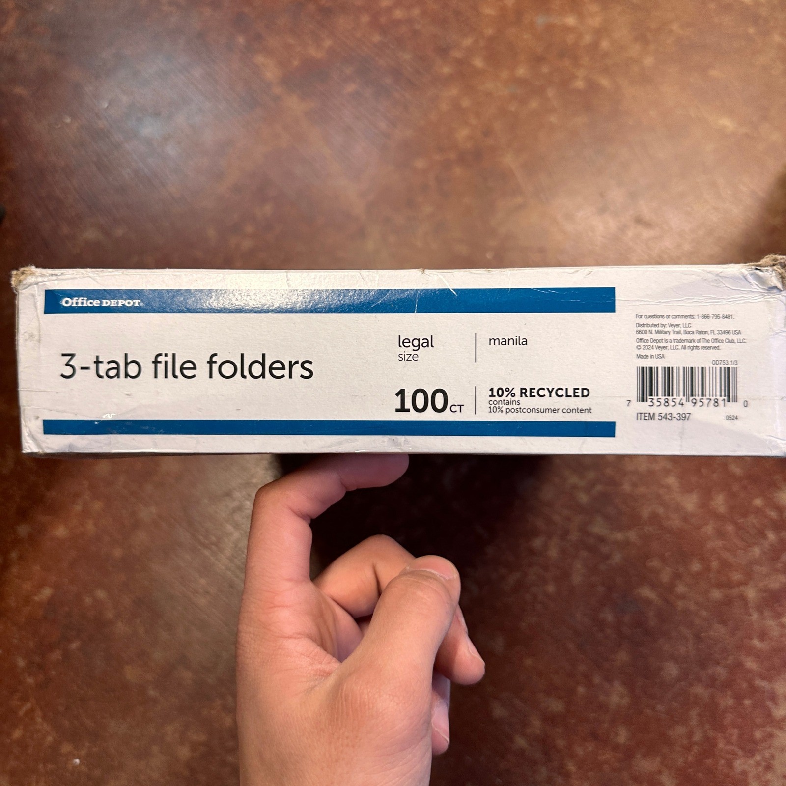 Pack of 100 Office Depot File Folders, 1/3 Tab Cut, Legal Size, Manila